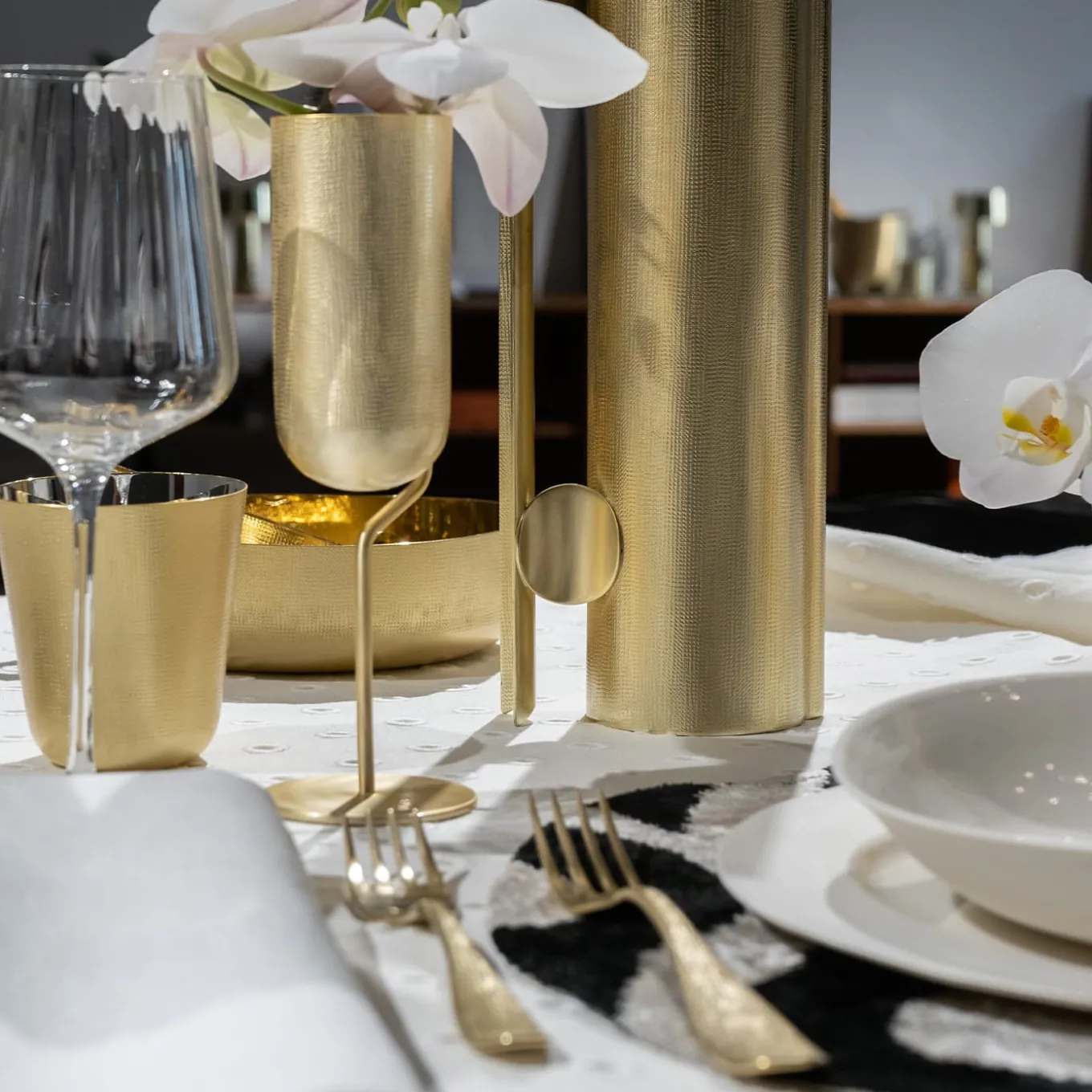 When brass and texture become Velvet for table jewels, for an exceptional mise en place. The brass is worked with the unique Zanetto know-how and special hammering to obtain a surface that is like velvet to the touch. Gold plated glasses with fine workmanship making them stainless and more resistant to different types of beverages.
