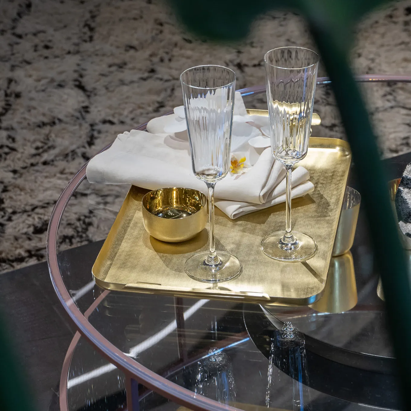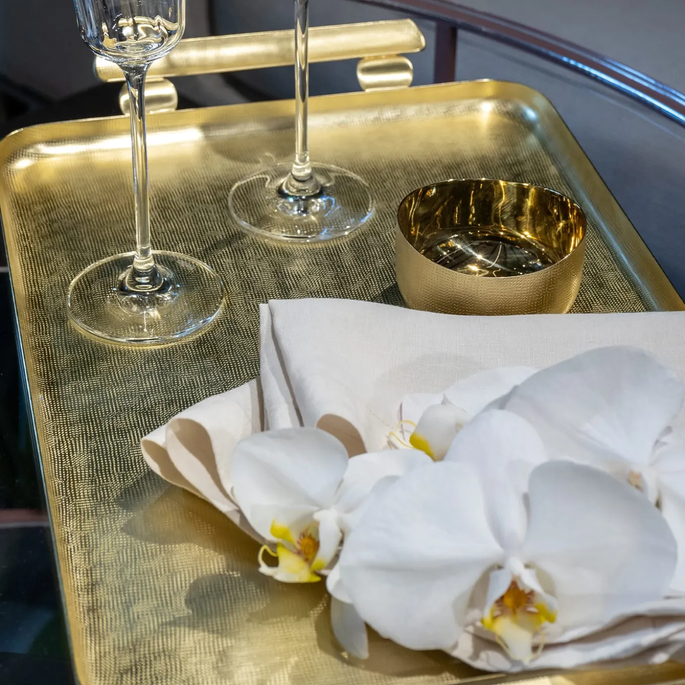 When brass and texture become Velvet for table jewels, for an exceptional mise en place. The brass is worked with the unique Zanetto know-how and special hammering to obtain a surface that is like velvet to the touch. Called “light gold brass” due to the resistance and the stainless property that this special work gives to the material.