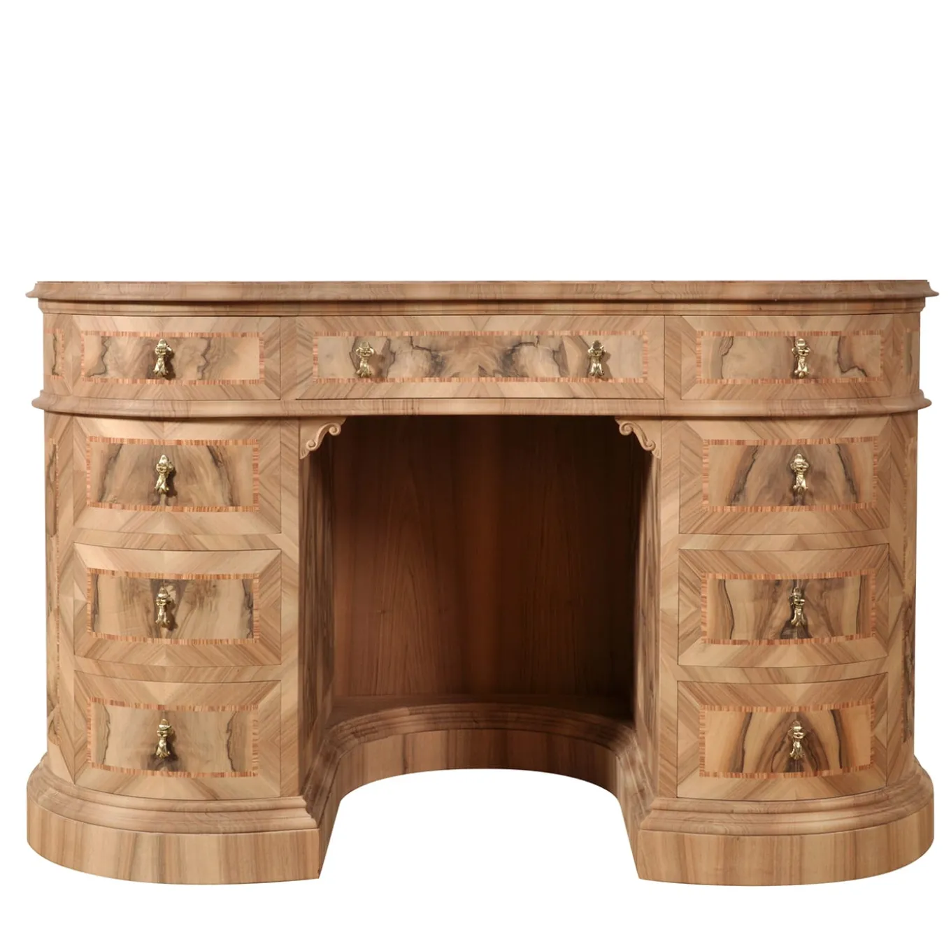 A rare and prestigious Venetian “bean-shaped” desk with nine drawers, masterfully hand-inlaid in fine woods such as walnut, bois de rose, and rare Ferrara walnut burl. The refined mirrored marquetry and solid brass pendulum handles, crafted using traditional 18th-century techniques, highlight its exceptional artistry. Complete with a concealed secret compartment, a reproduction of this masterpiece proudly graces the official residence of the President of the United States, The White House.