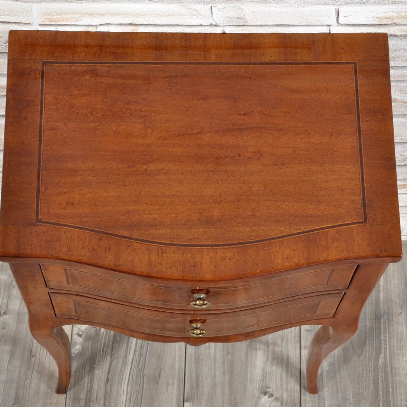 Refined nightstand featuring two drawers with delicate inlaid detailing in contrasting wood tones. The elegantly curved “en cabriolet” legs complement the central arched, bulbous form, inspired by a historic Venetian design from the late 1700s. The finely polished surface showcases the intricate craftsmanship characteristic of high-quality cabinetry. Customizable options for dimensions and finishing techniques are available to suit individual preferences. Contact the Concierge for more details.