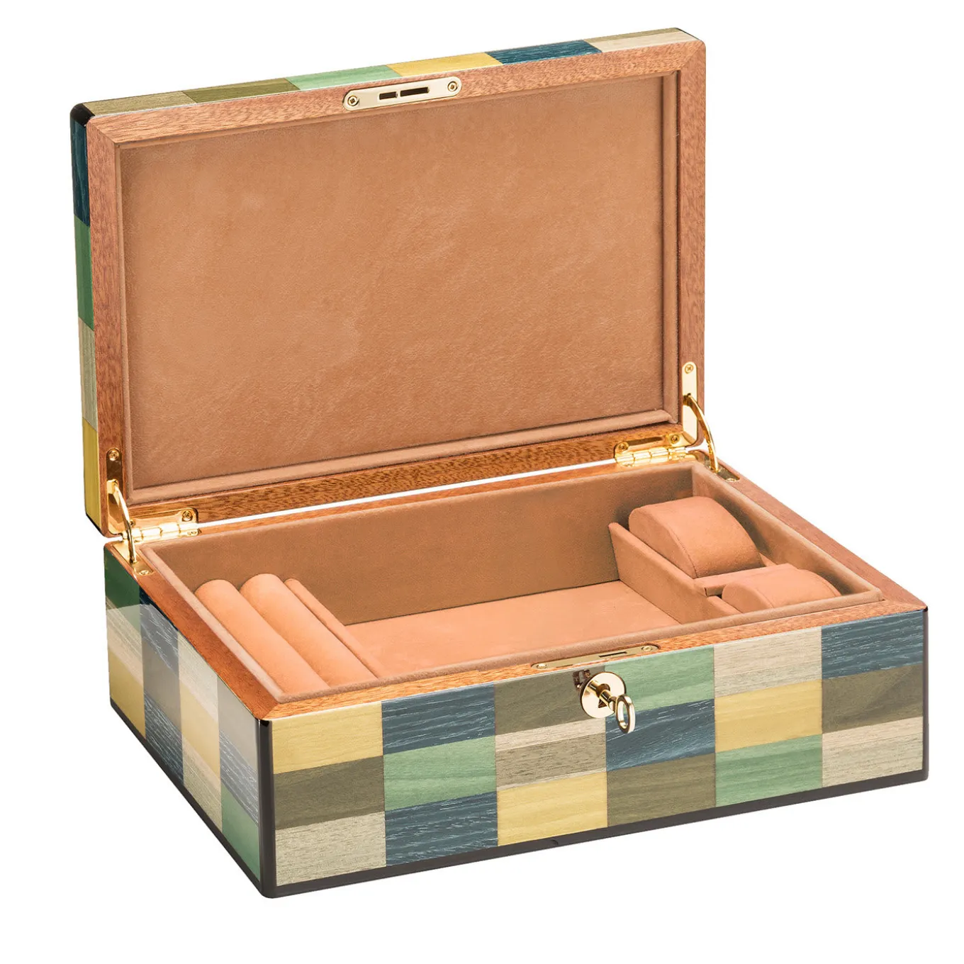 An elegant and refined design, this jewelry box will make a sophisticated accent on any classic or modern vanity. Crafted of mahogany wood enriched with gold-finished metal details, the box boasts a handmade veneered inlay of earth-toned rectangles, complementing the beige Alantara fabric. It features a ring holder, an open compartment, and two watch holders.