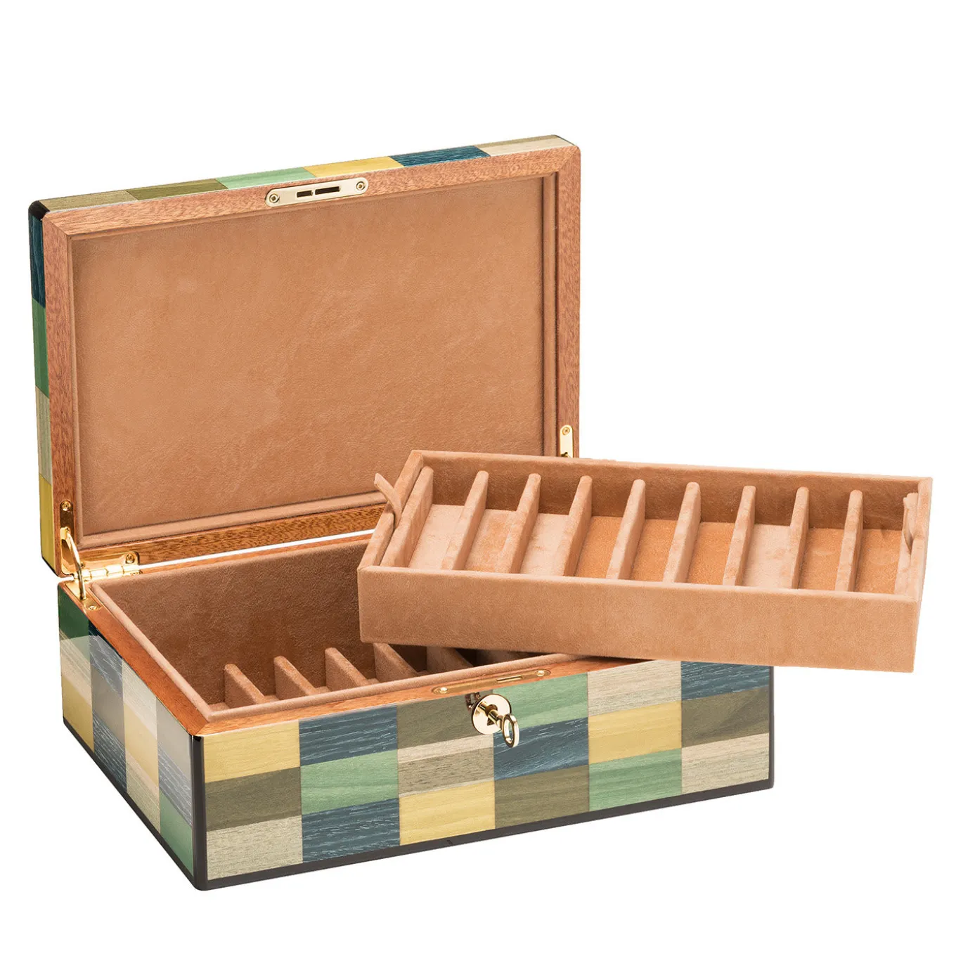 The best piece to complete the decor of a modern writing desk in a home study or office, this pen case flaunts a clean and essential design inspired by modern art abstract and geometric subjects. Handcrafted of mahogany wood with gold-finished metal details, it features a removable tray that can store up to nine pens placed above a similarly ample tray. Lined with beige Alcantara, the piece is adorned with handmade inlay works of strong geometric value.