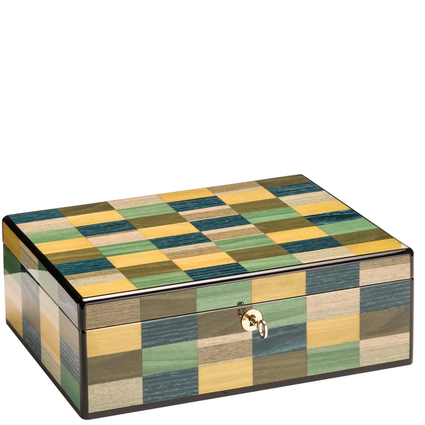 Ideally combined to the jewelry box from the Venezia Mestre Collection, this watch case will make a bold and refined statement in any style decor. Masterfully crafted and veneered by hand, it is fashioned of mahogany wood enriched with an inlay work of a series of yellow, blue, and green rectangles lending it a modern charm. Enriched with gold-finished metal details, its internal structure stores up to eight watches and is upholstered with beige Alcantara.