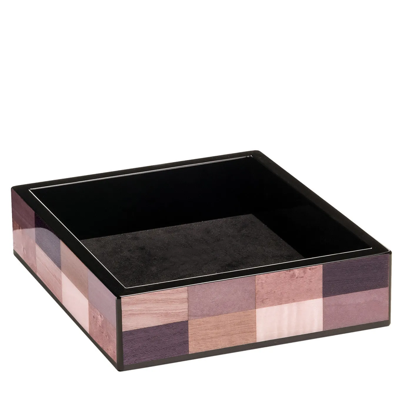 A stylish and charming accent to a modern entryway console, this empty-pocket tray combines practicality and aesthetic in an elegant and refined design masterfully handcrafted of wood. Lined with black Alcantara, its inner structure juxtaposes the bold checkered motif inlaid on the outer wooden surface, enhanced with polished pastel tones of pink, beige, and brown.
