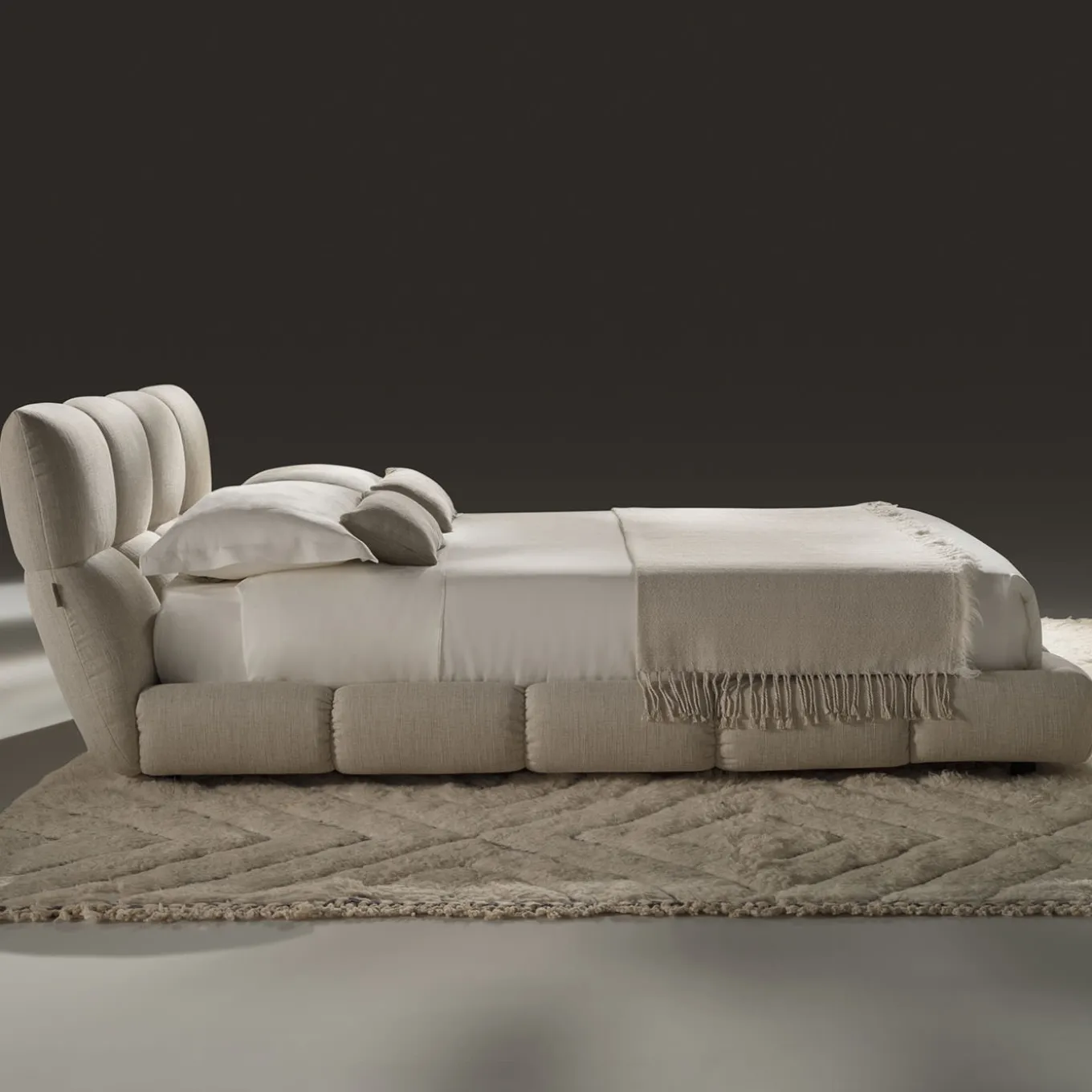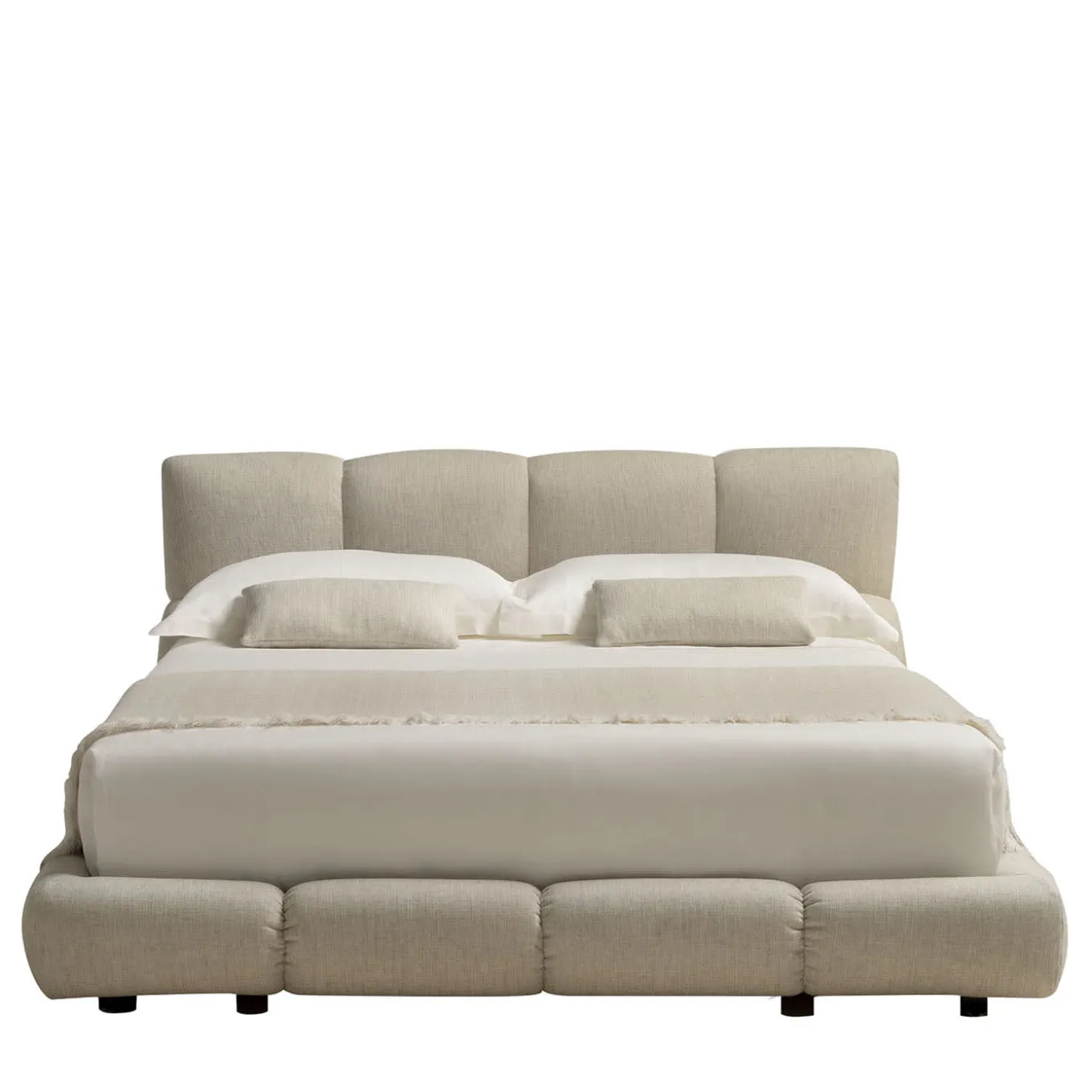 Venice is an iconic bed in beige fabric, defined by its strong personality and elegant design. The curved shapes and slender, enveloping lines create a sophisticated aesthetic, making it a standout piece in any bedroom. The bed exudes modern elegance while offering a serene and comfortable place to rest. Perfect for those seeking both style and comfort in a timeless design. Bed base is included in the price. Mattress, textiles and cushions are not included.