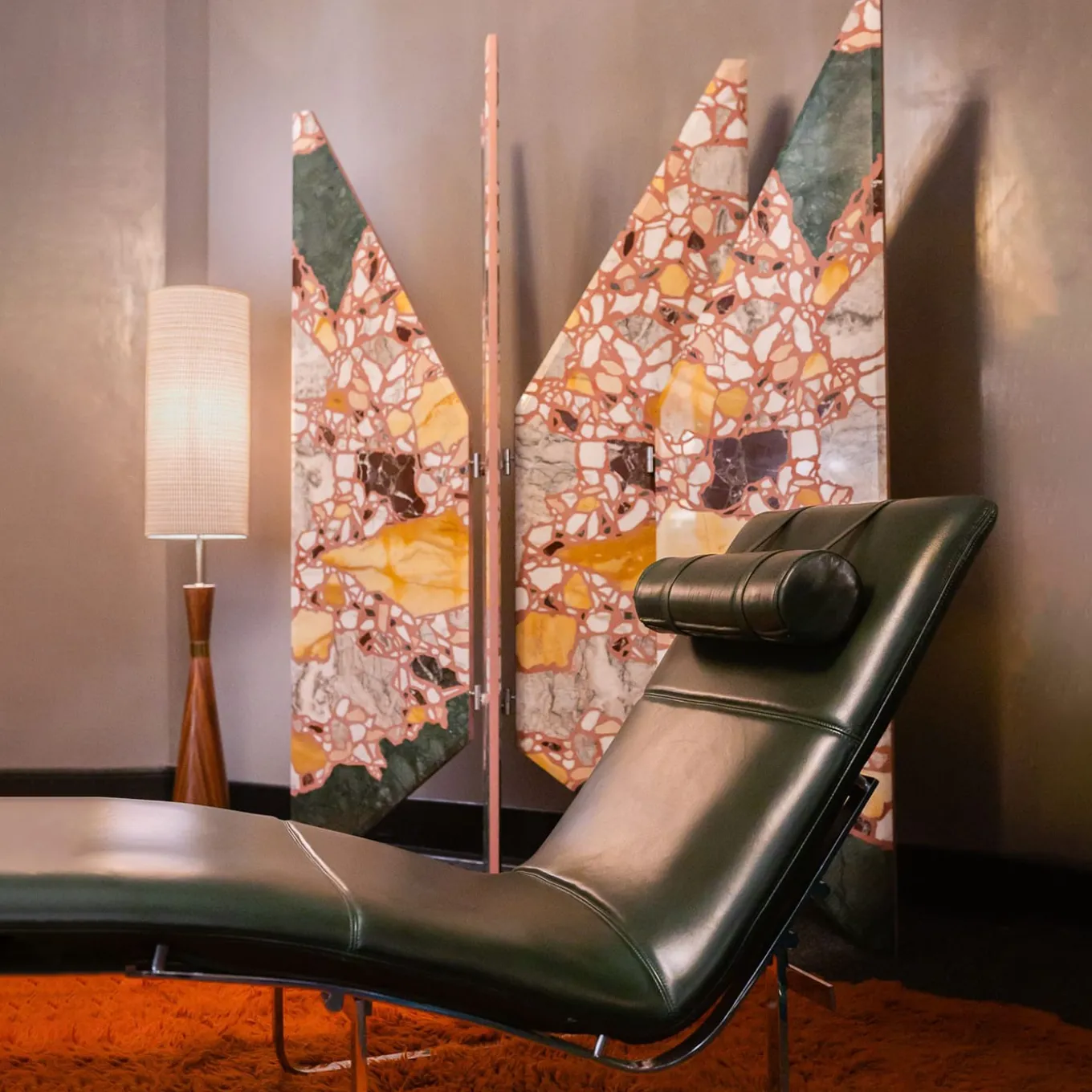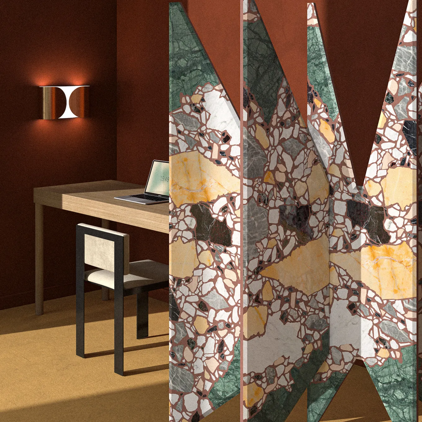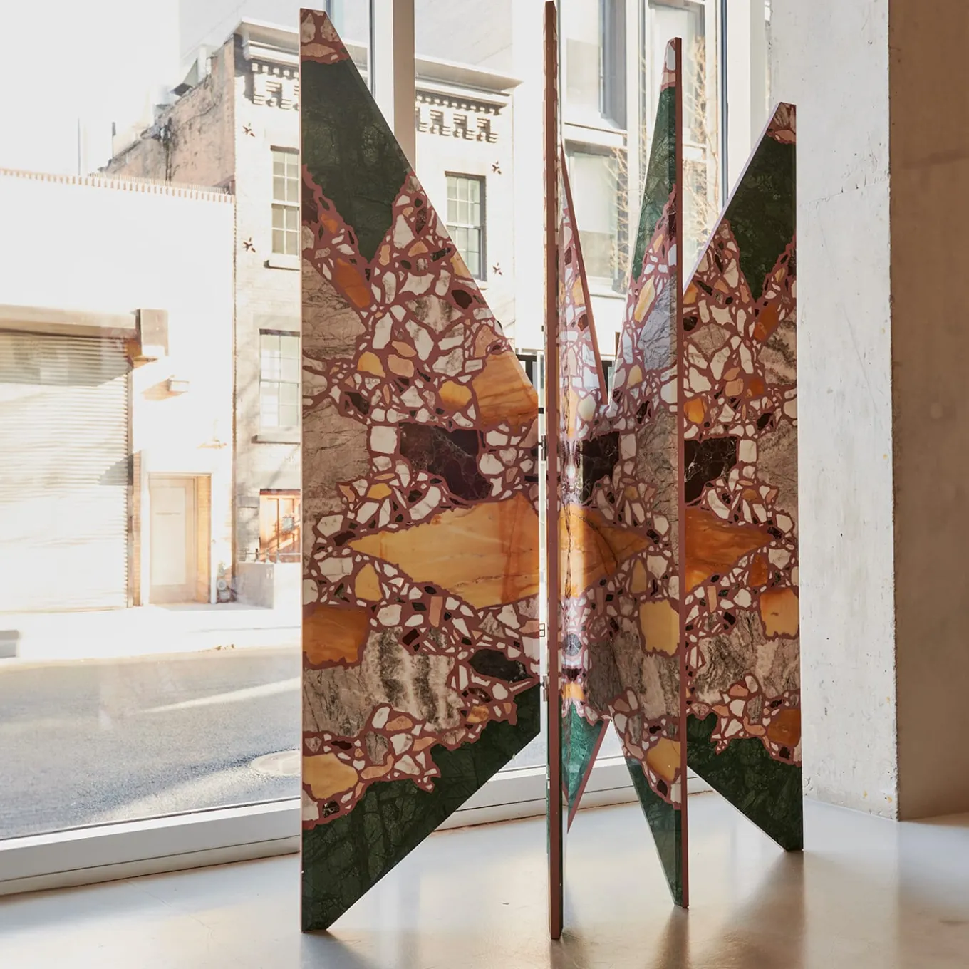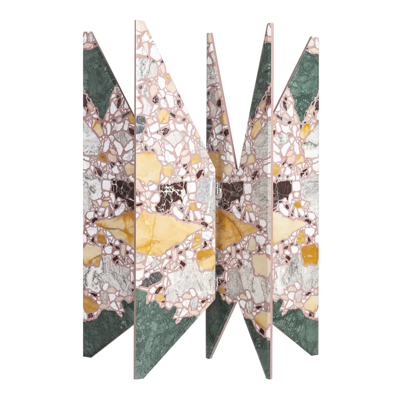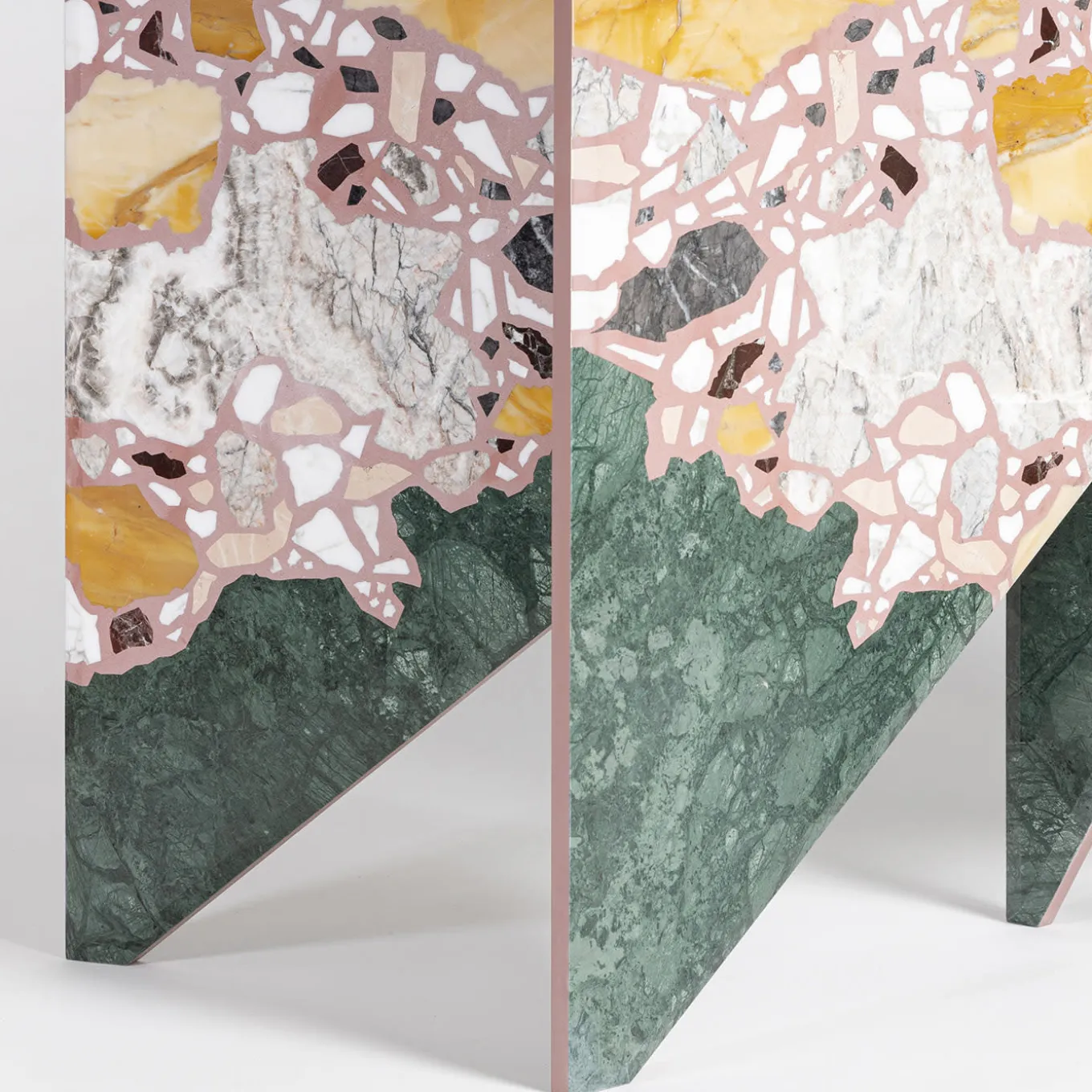 A unique pattern made up of 7 different precious marbles: the piece of the architect and designer Hannes Peer, which results from a dialogue with Del Savio 1910, enhances the use of stone, and embodies the encounter of creativity and craftsmanship into a shield of exceptional sculptural impact. With its radial development, the piece recalls the wind rose and it arouses curiosity for its graphic effect created through a process of controlled randomness. The shield is also a symbolic homage to Milan and its most iconic architecture. The light and mobile shapes recall the spires of the Duomo Cathedral, the beveled edges recall the Pirelli Skyscraper of Gio Ponti. This item has been part of the on display at until May 2023.