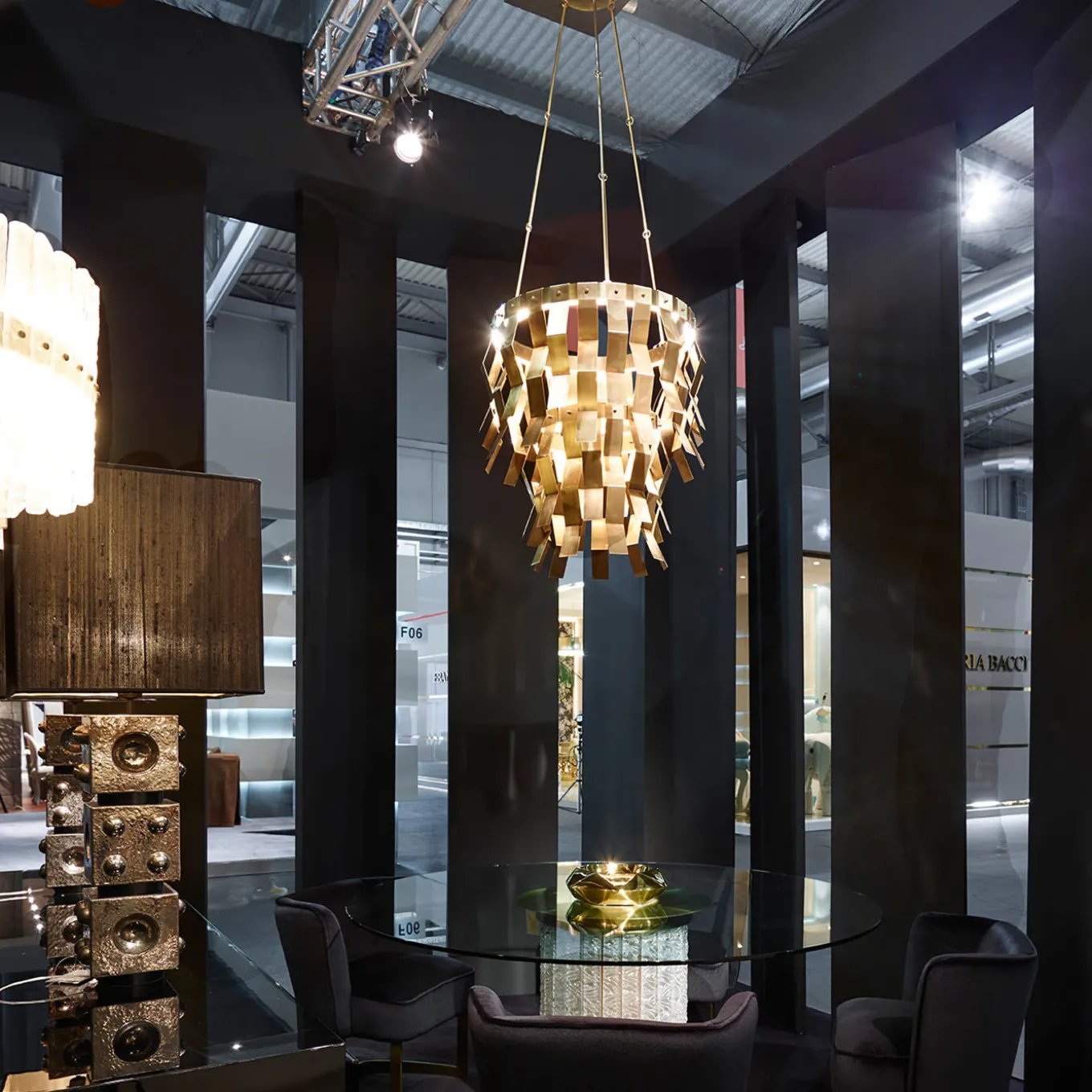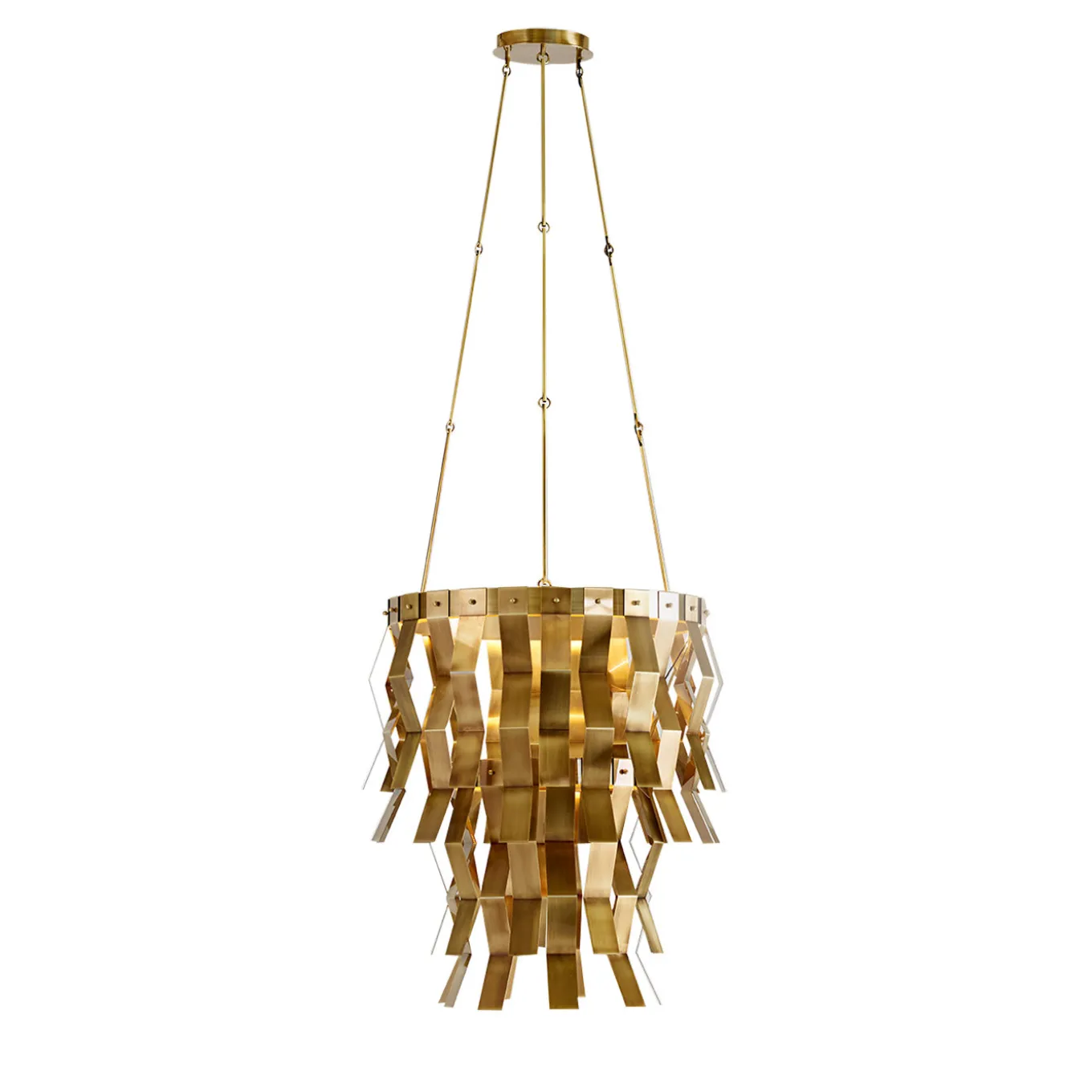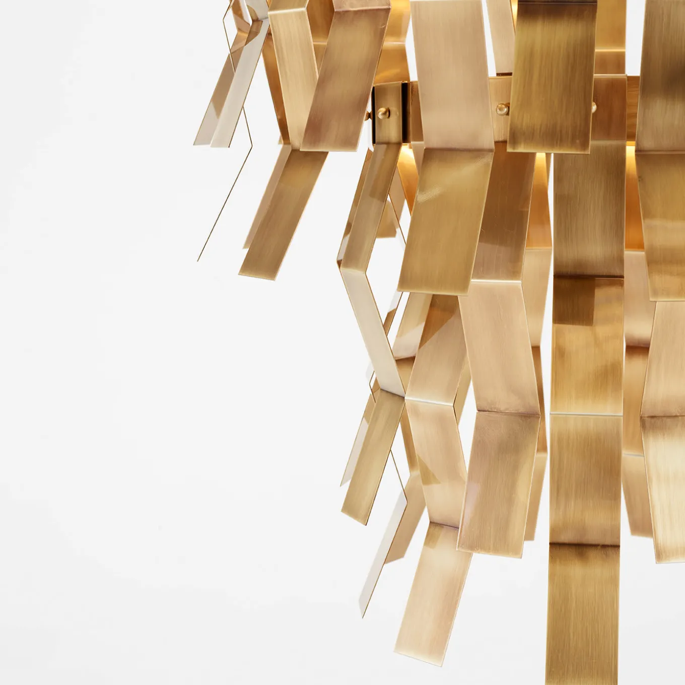 Hanging light fixture made of brass with decorative elements, mostly folded strips, hanging from its circular top, providing a charming approach to decoration. This is one of the distinctive pieces of the aesthetic proposed by Studio 63 for Marioni.