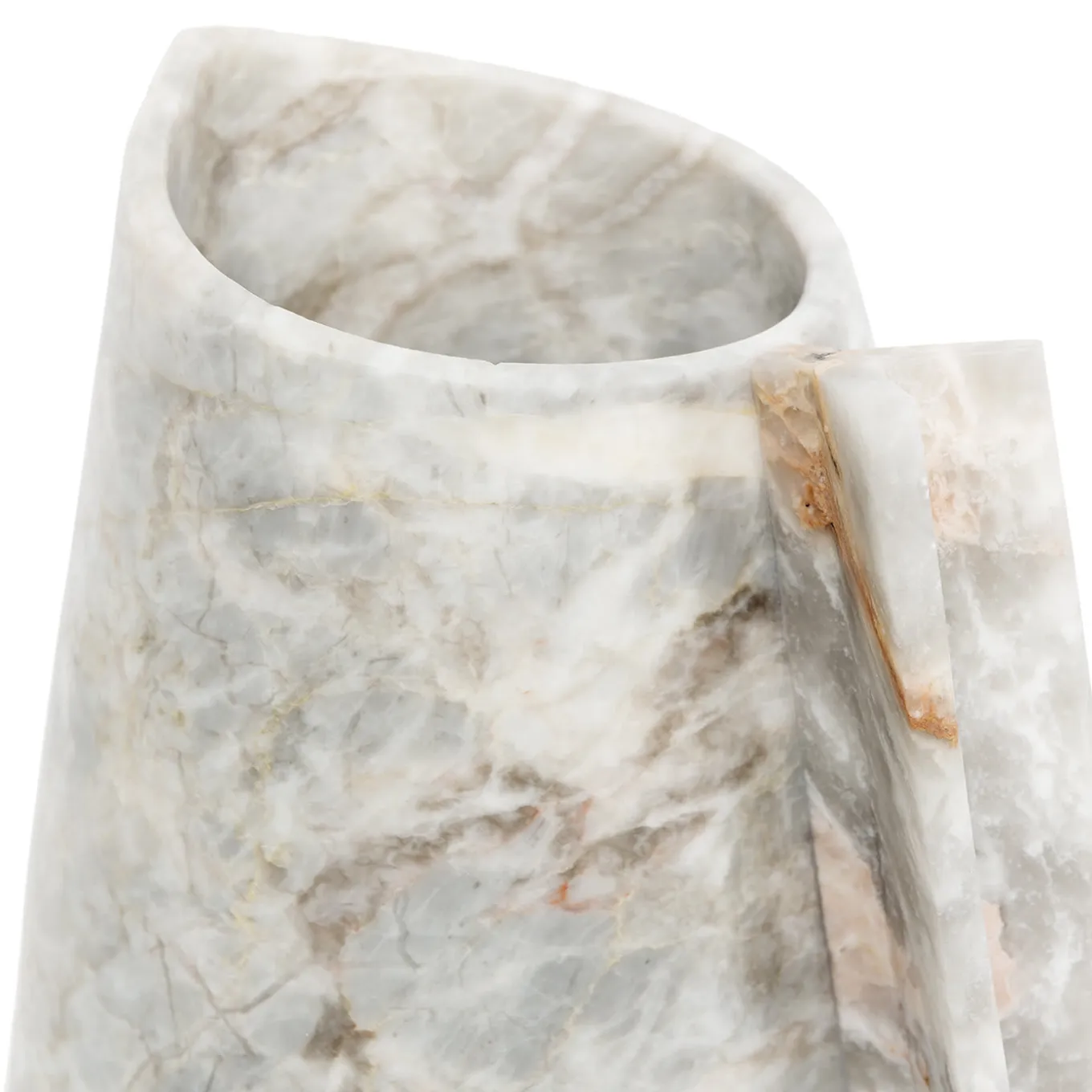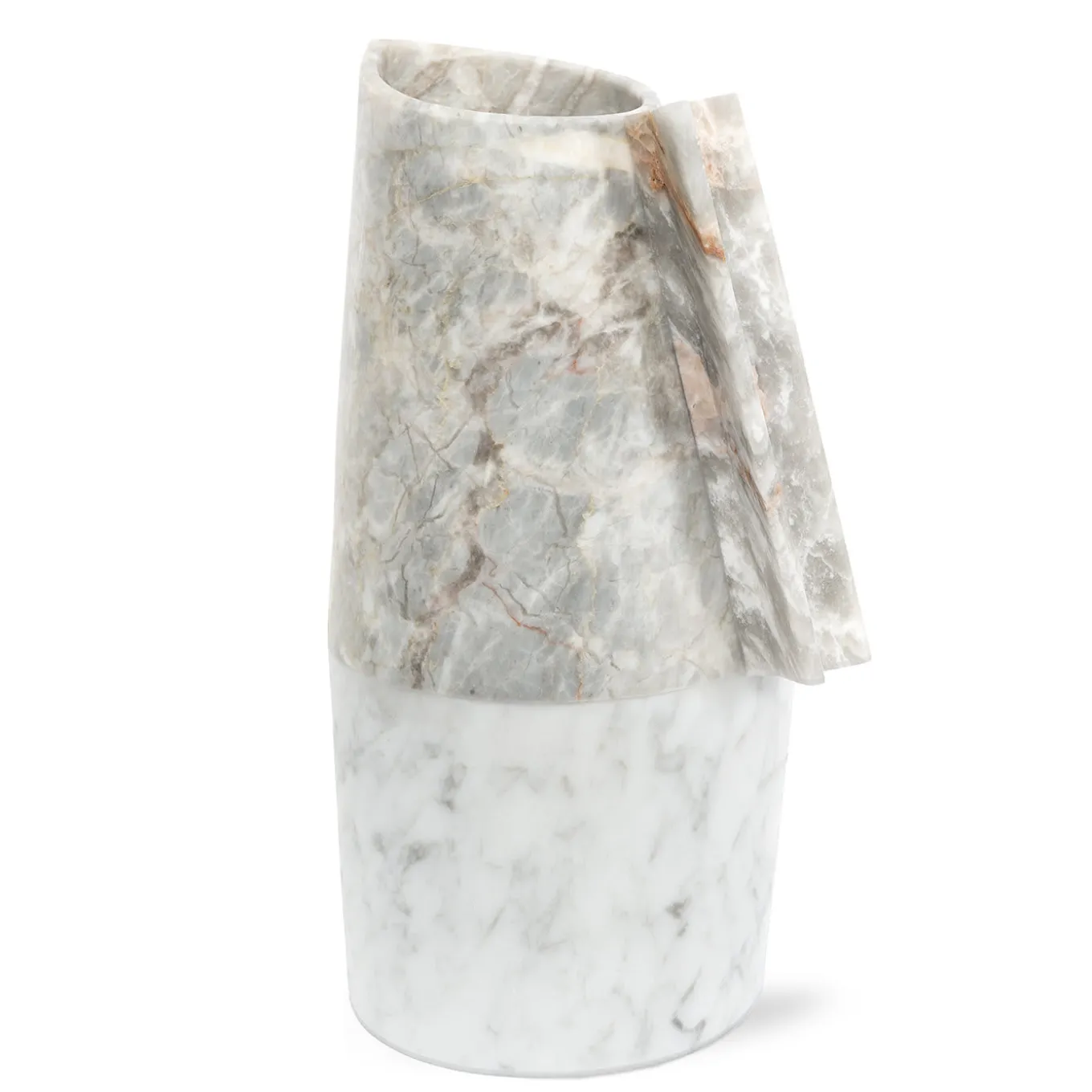 A study in form and material, this refined carafe will add a timeless and modern touch to a dining table or kitchen countertop. Designed by Patricia Urquiola for Editions Milano, the carafe is hand fashioned of two types of marble, the top made of light-grey with delicate red veining and the bottom in white. The irregular shape of the carafe is highlighted by the teardrop-shaped mouth, the upward-tilted spout, and the flat-edged handle, creating a visually intriguing yet harmonious piece.