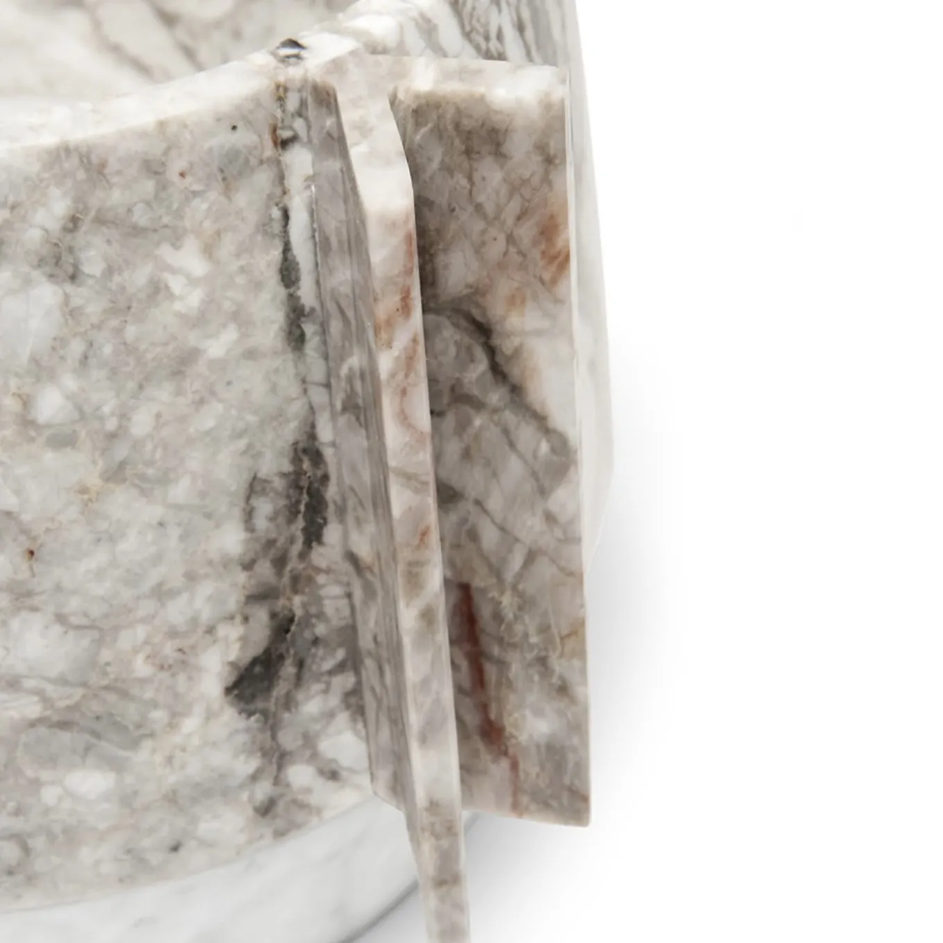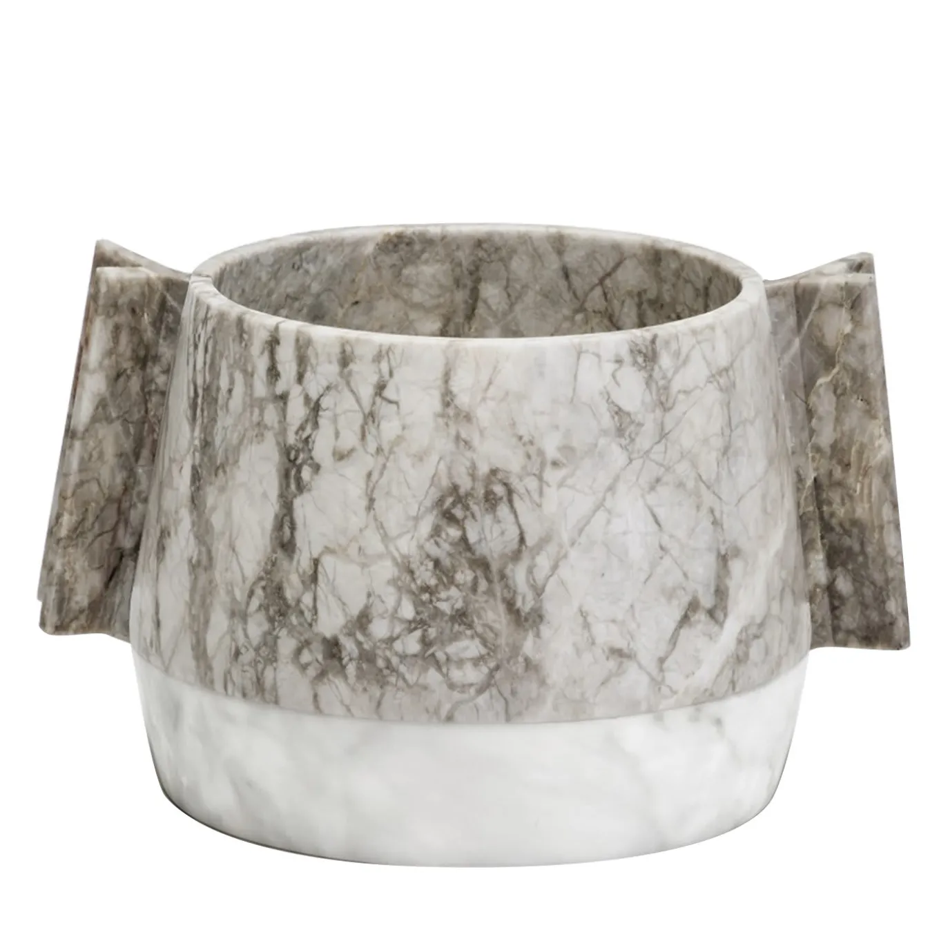 This unique ice bucket is a splendid sculptural object of functional decor to be showcased on a formal table on special occasions. Entirely crafted by hand with a round shape, the base of white Carrara Gioia marble with fine feathery grey veining complements the light white and gray tones of the Fior di Pesco Carnico marble top, characterized by distinctive ivory and rosé veins. The handles have an eye-catching V shape and are arranged vertically along the slightly tapered top.