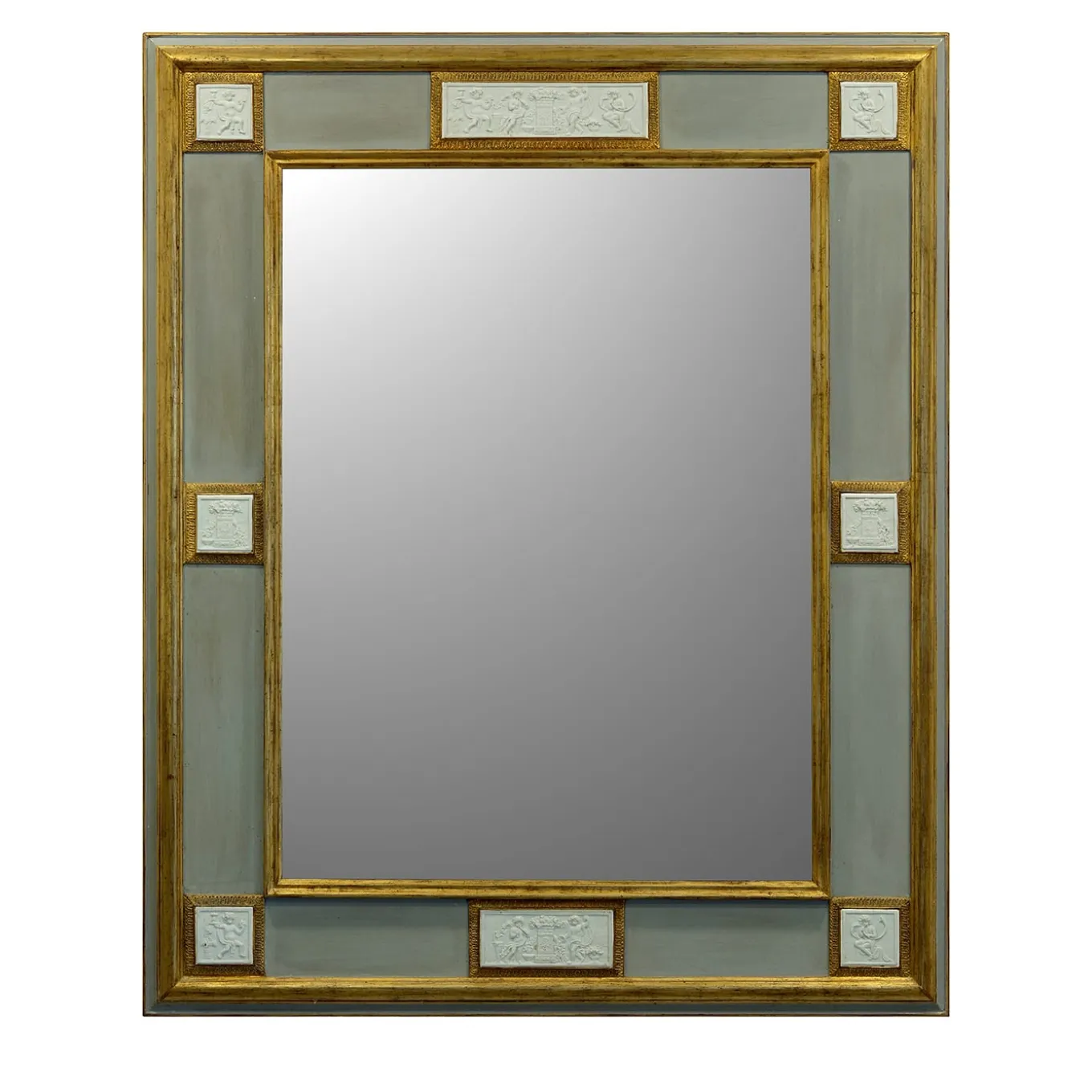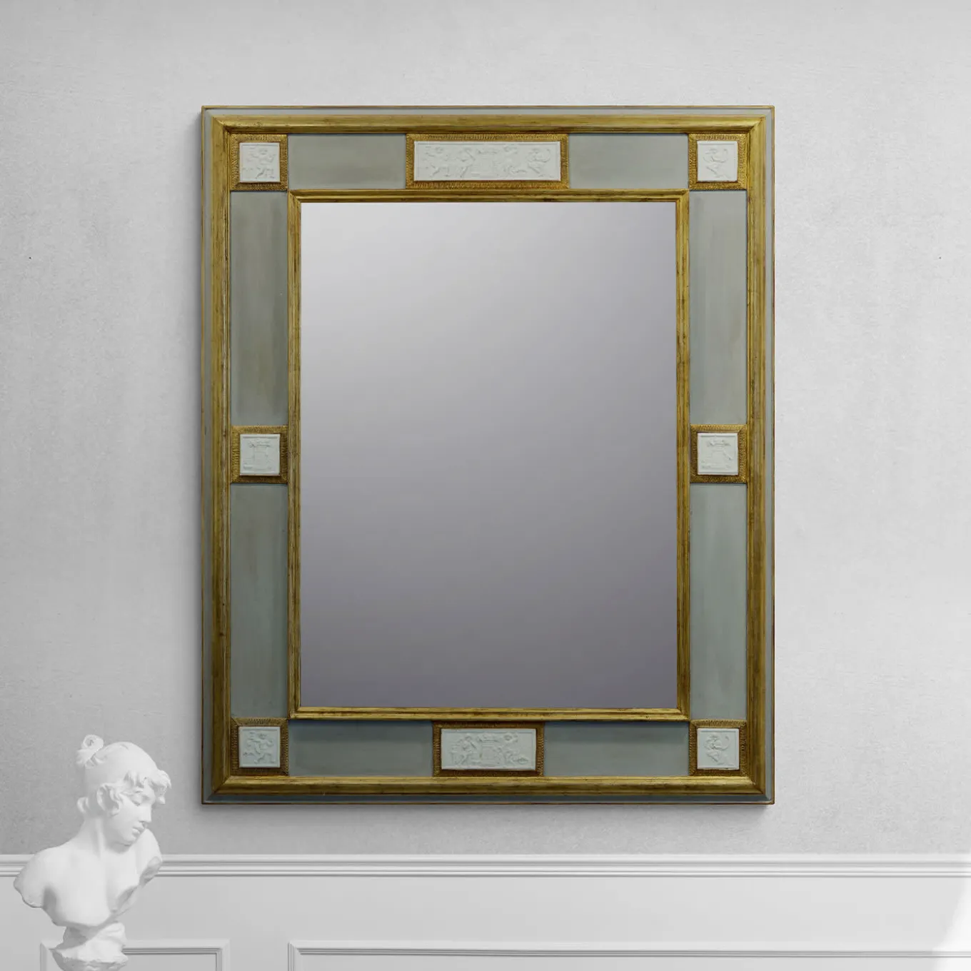 Vertical wall mirror featuring finely detailed biscuit porcelain plaques with allegorical scenes created using an advanced firing technique. framed in lacquered and gilded wood, this piece offers a blend of classic artistry and versatile design. Customization options available for both size and finish upon request. Please contact the Concierge for more information.