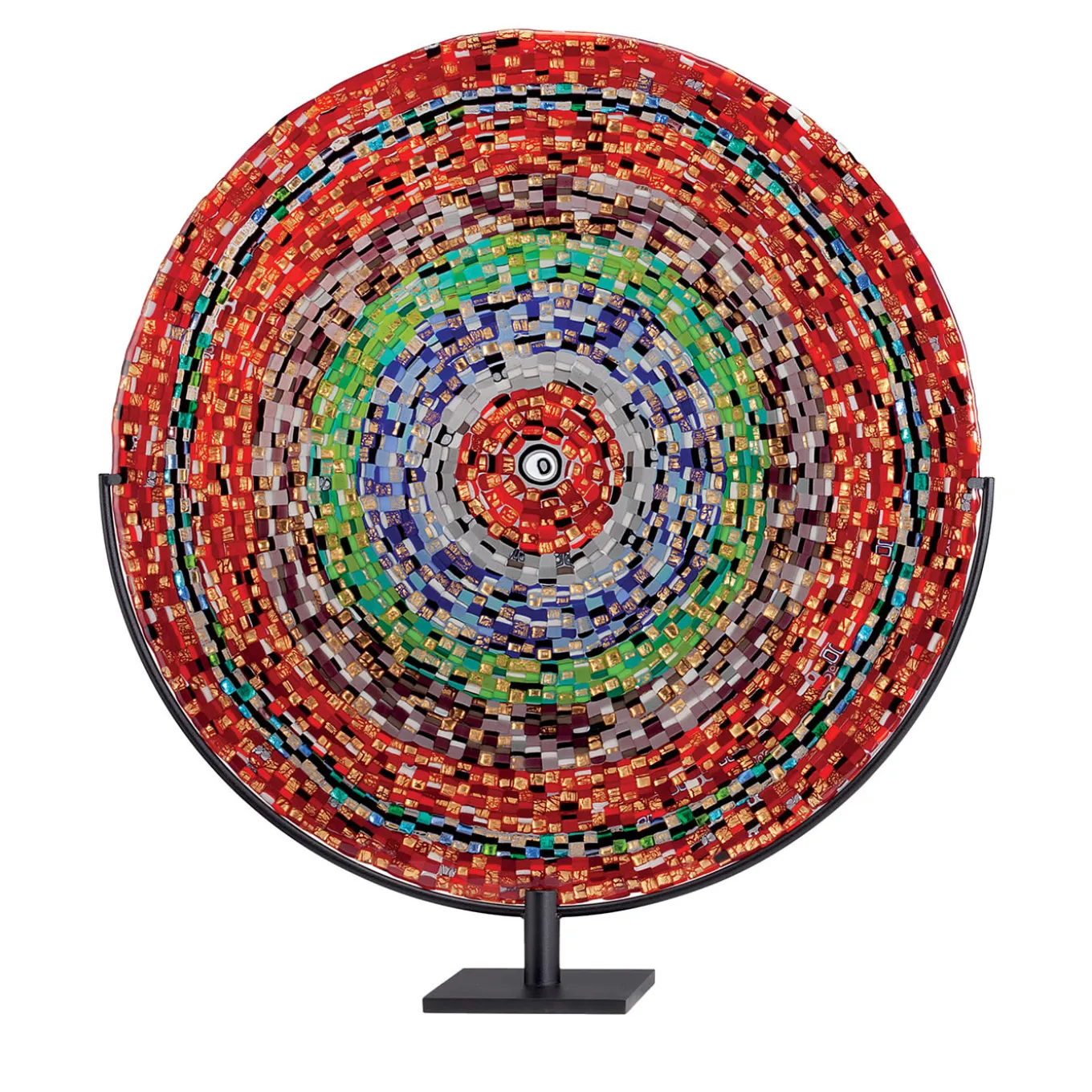 Brimming with contemplative charm while not losing its whimsical flair, this sculpture is sure to catalyze attention in all sorts of public or domestic spaces. An essential metal base varnished in anthracite gray sustains the massive disk, which is obtained from the painstaking manual assembly of Murano glass tiles according to richly-conflicting concentric succession of brilliant hues.