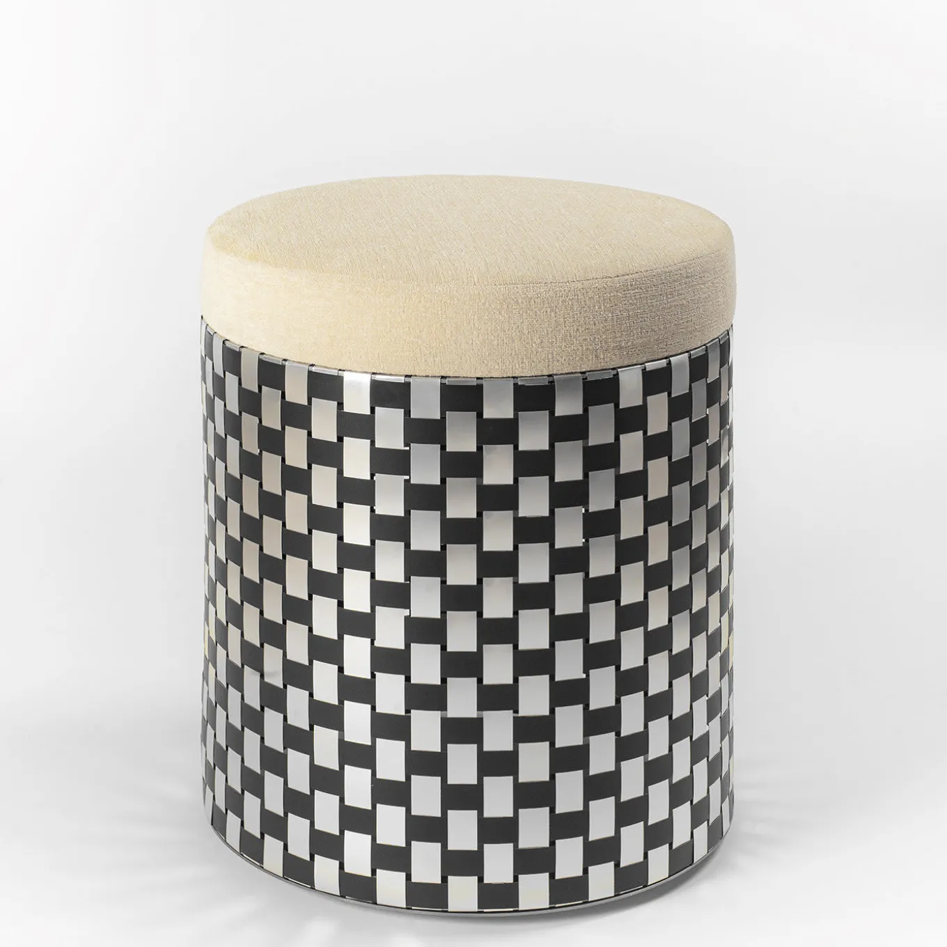 Inspired by the Optical Art movement of the 1960s, this splendid pouf flaunts a visually captivating and shimmering design fashioned by interweaving black and natural-finished aluminum slats recycled from industrial waste, a technique known as Splot. Showcasing a classic cylindrical silhouette completed with a fine beige cushion, it will make a warm and sophisticated addition to a modern interior.