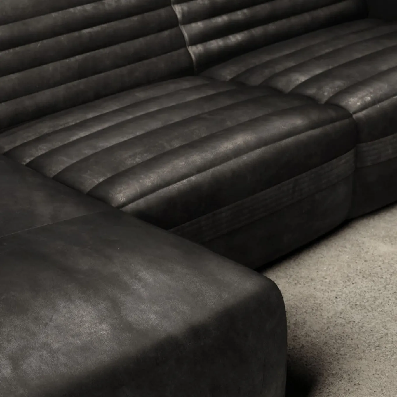 Vicious is a modular sofa composed of 4 modular elements: end module, middle module, corner module and chaise longue. The Vicious sofa, available in fabric or leather, is composed of a wooden frame covered in high-density polyurethane foam and a top layer of goose down to ensure absolute softness and comfort. This configuration of Vicious is upholstered in Timeless leather, which is chrome-tanned, vacuum-dried, aniline-finished, and hand rubbed to achieve a washed effect and soft touch.