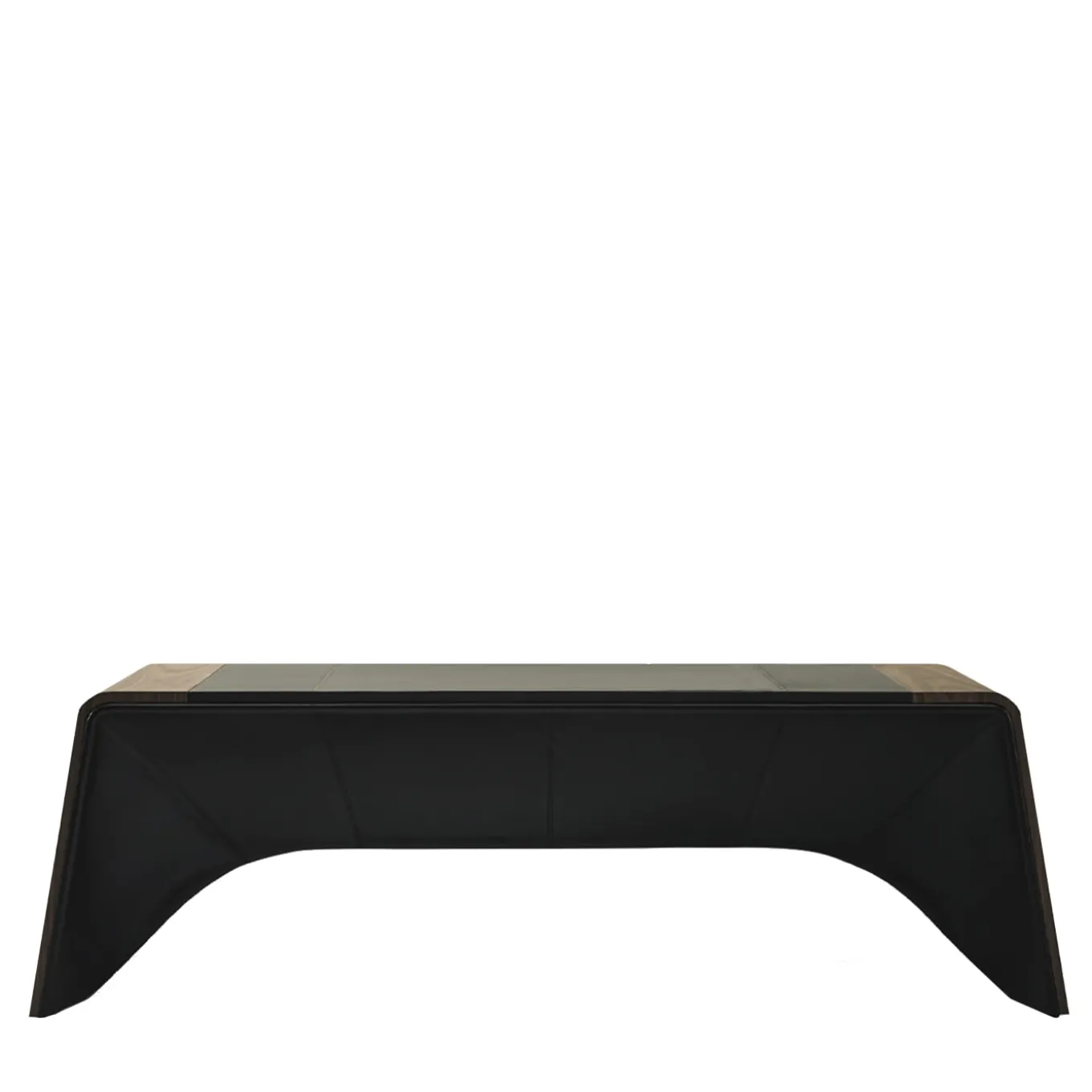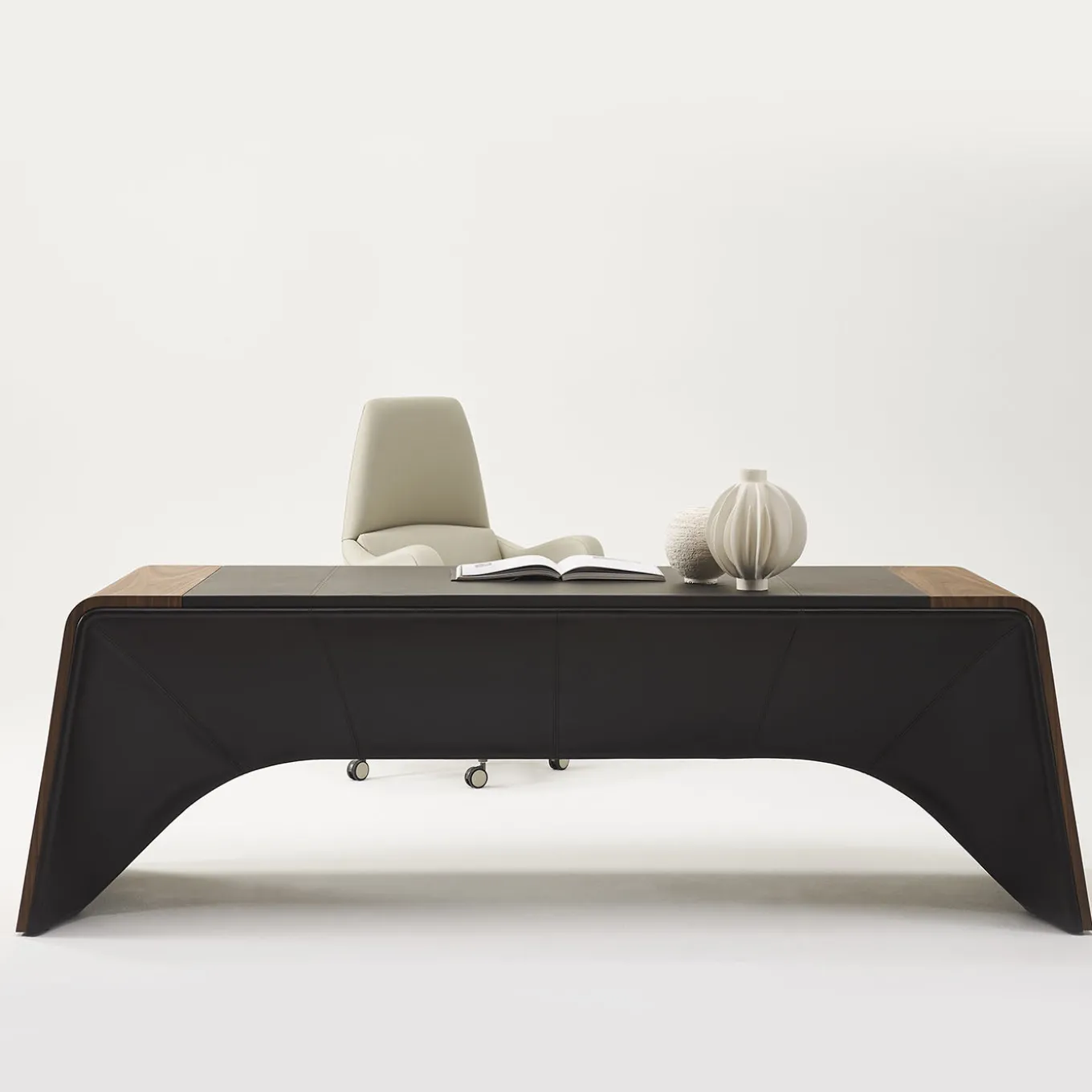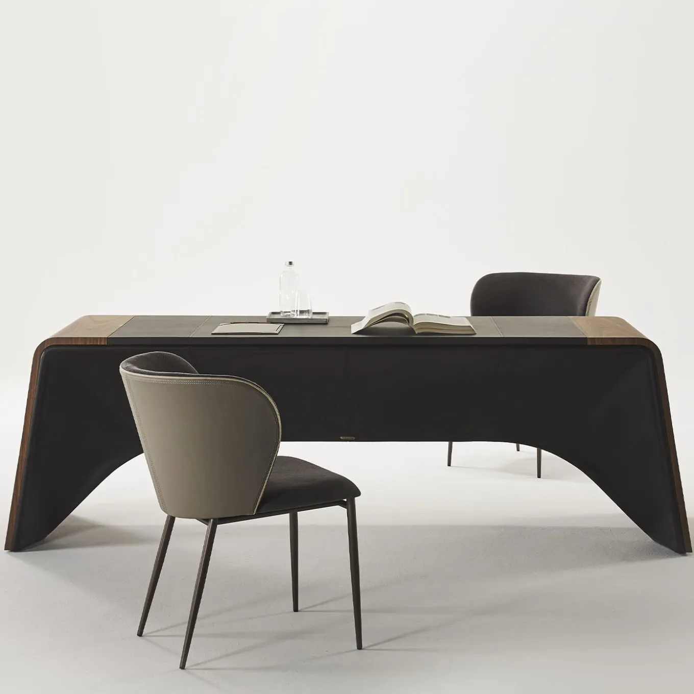A design of sculptural flair, this sophisticated writing desk epitomizes a perfect coexistence between straight lines and sinuous curves. Fine P3 leather covers the base, a refined tailored addition that well harmonizes with the desk blotter upholstered in P2 leather for a superb tactile feel. A combination of plywood and solid wood characterizes the imposing wooden structure.
