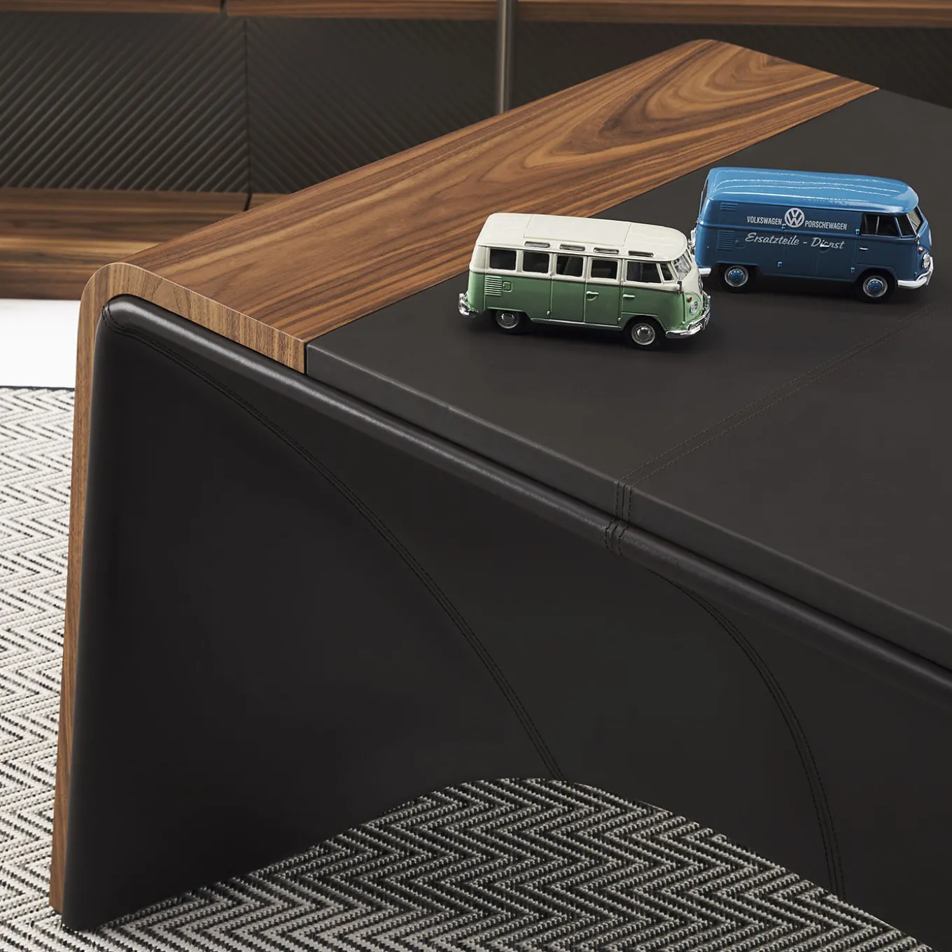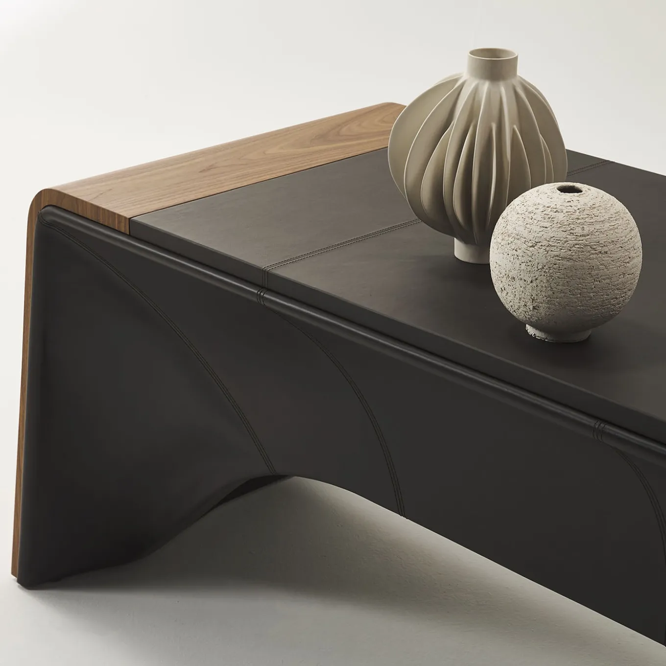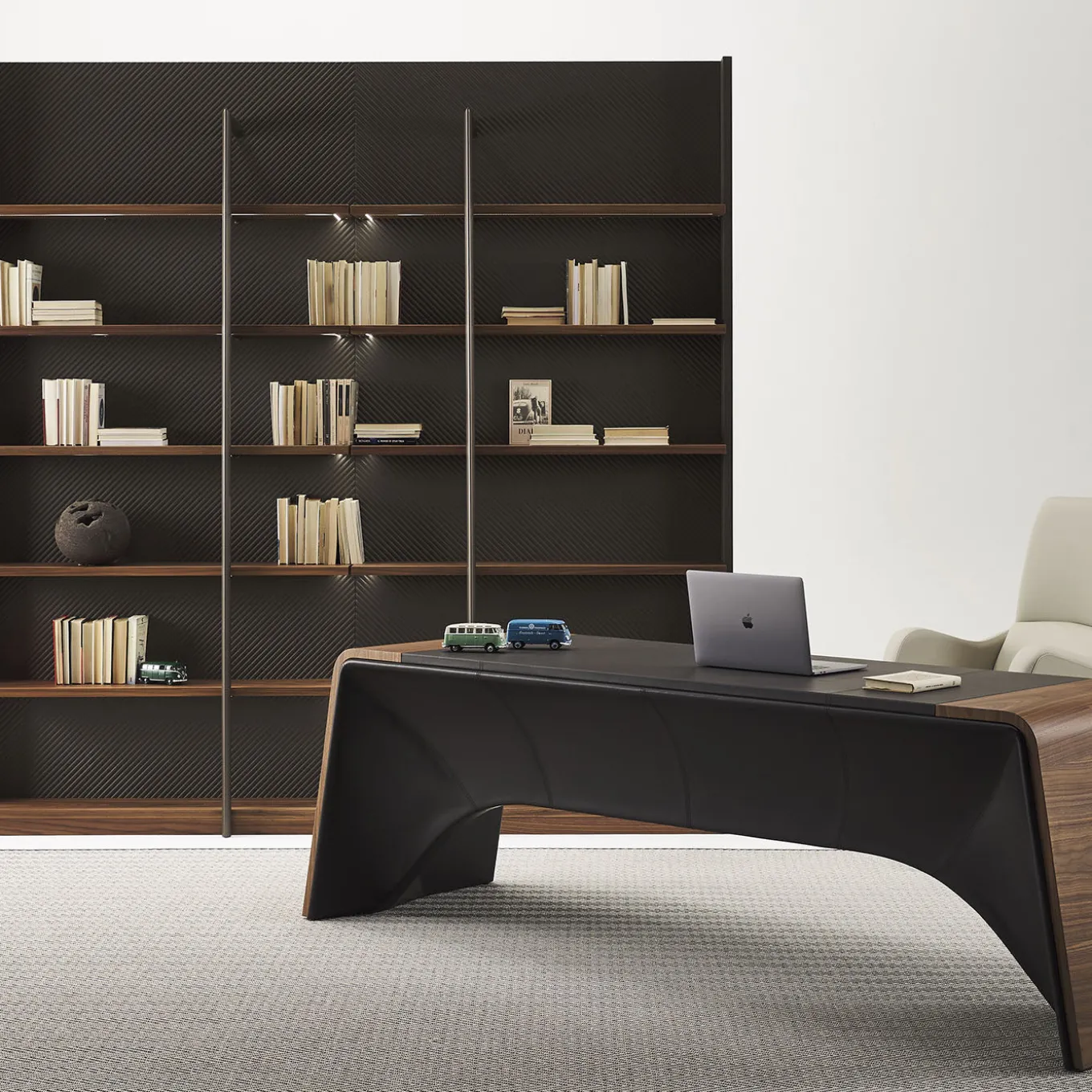 A design of sculptural flair, this sophisticated writing desk epitomizes a perfect coexistence between straight lines and sinuous curves. Fine P3 leather covers the base, a refined tailored addition that well harmonizes with the desk blotter upholstered in P2 leather for a superb tactile feel. A combination of plywood and solid wood characterizes the imposing wooden structure.
