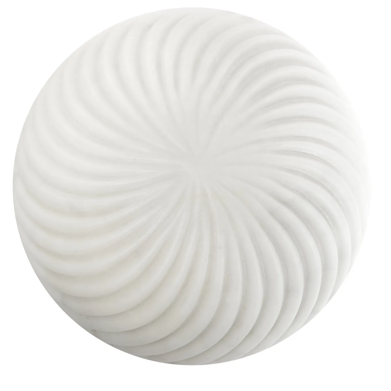 Inspired by pieces from the Victoria & Albert Museum in London, this refined table lamp by Welsh designer Bethan Gray will be a stunning complement to an entryway console, living room side table, or sideboard. Entirely handcrafted by master Italian artisans, the orb-shaped lamp is carved from white Arabescato marble with relief grooves whose sinuous curves and fine edges add a delicate finishing touch to the piece. The lamp is mounted on a cylindrical base in Arabescato marble with a gold-finished brass rim, the color contrast between the stone and metal creating dynamic visual balance.