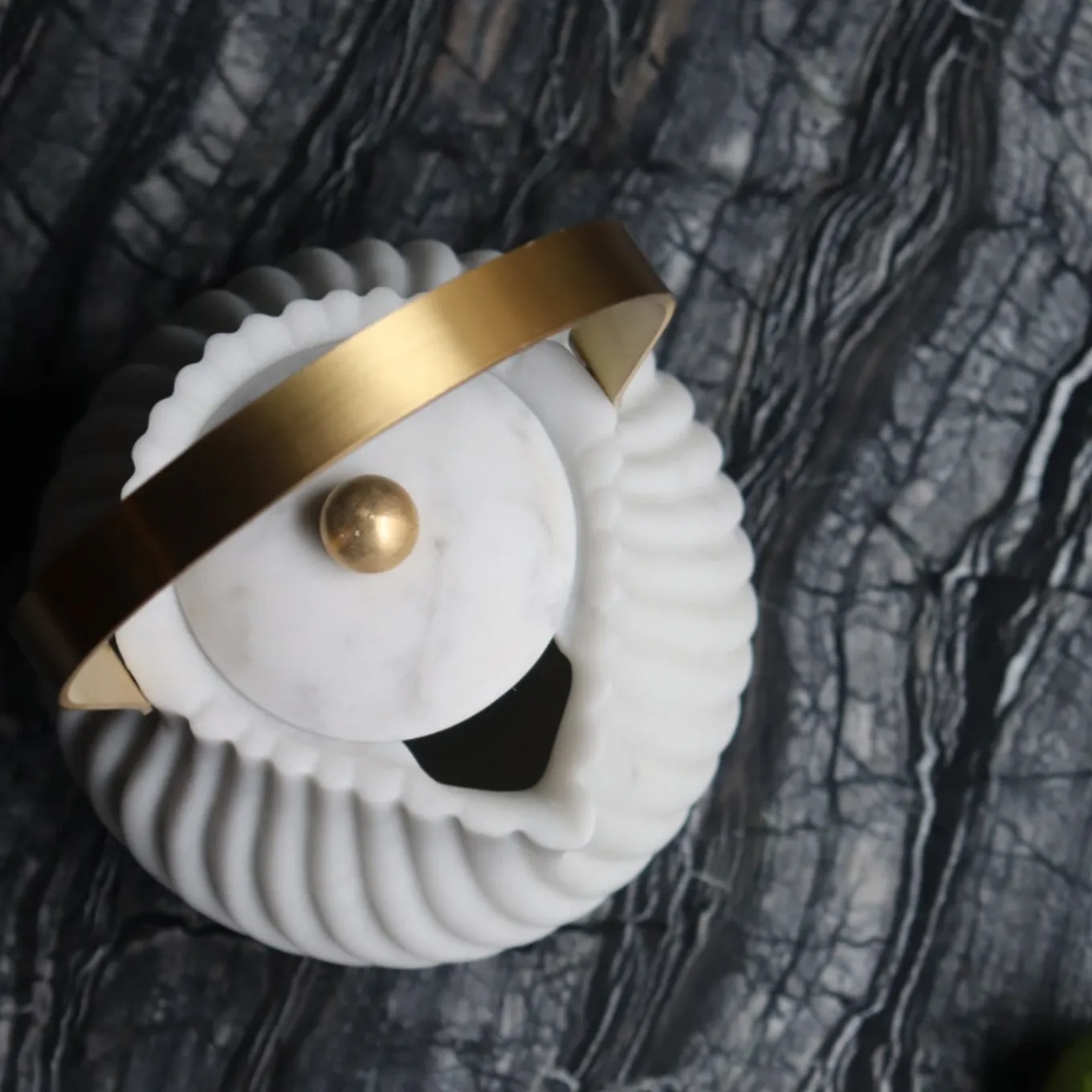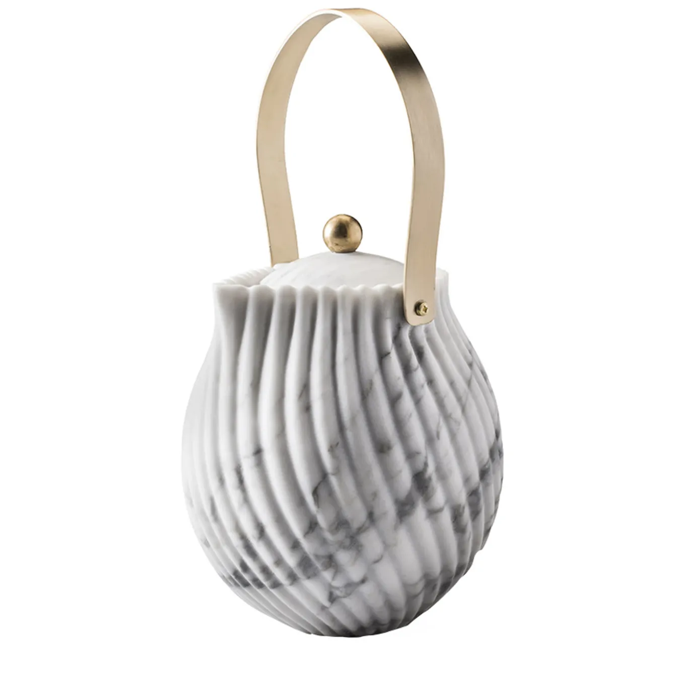 Part of the Victoria collection that celebrates the ritual of enjoying tea in the afternoon, this piece reinterprets the iconic teapot in a luxurious and sumptuous way, crafting a handmade marble piece that will make a sophisticated statement in any occasion. The pot and its lid are in Arabescato marble and the surface of the pot is carved with parallel groves that accentuate its delicate curves, while the elongated handle and the lid’s pommel are in brass. This exquisite piece can be combined with the others from the same series for a cohesive look.