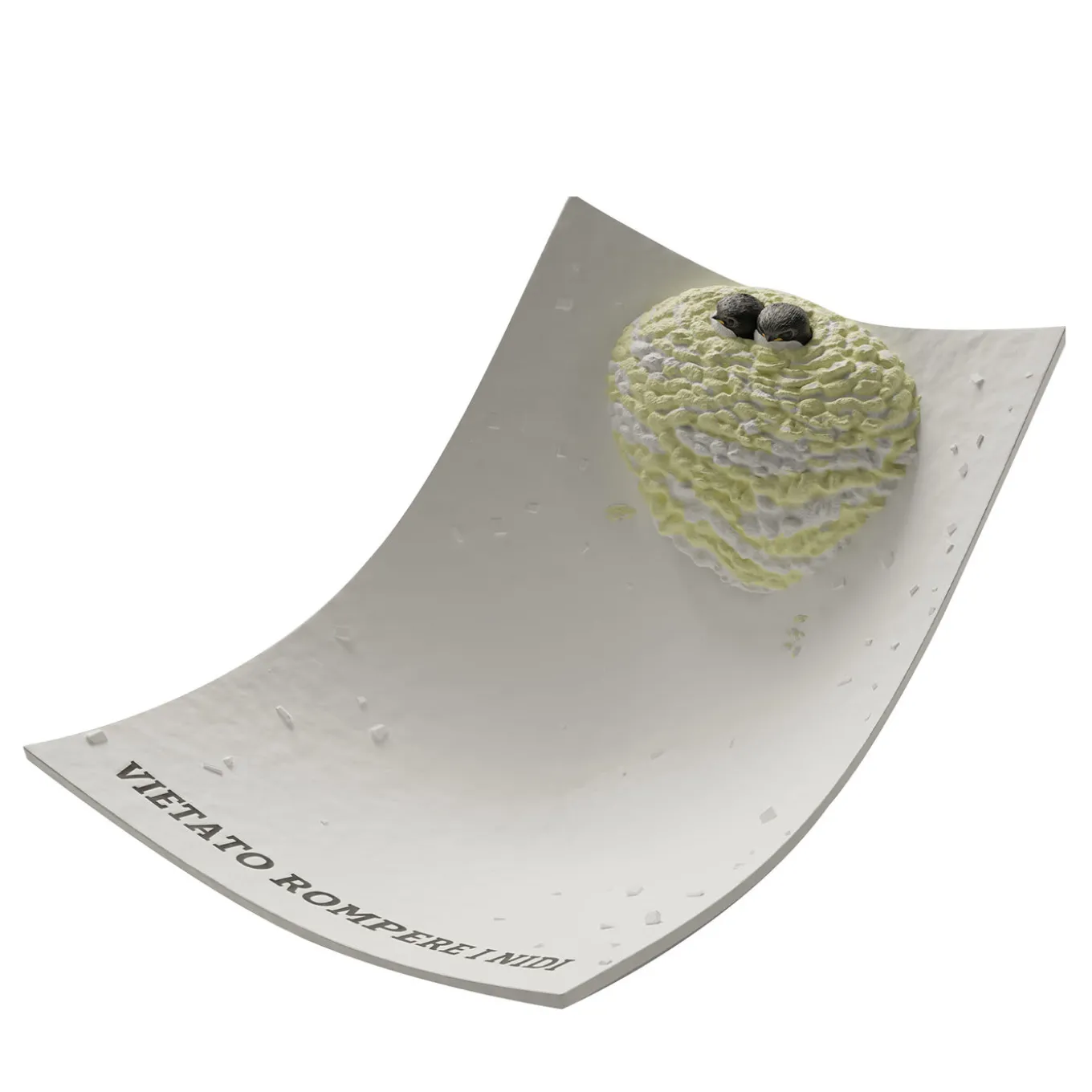 Artist Francesco Acone believes in raising awareness of environmental pollution through art. This precious ceramic sculpture shaped like a concave tile displays its title (“nest breaking forbidden” in English) on one extremity, while the other one features a damaged bird nest with eggs, small twigs scattered and incorporated onto the matt white backdrop for a dramatic visual effect.