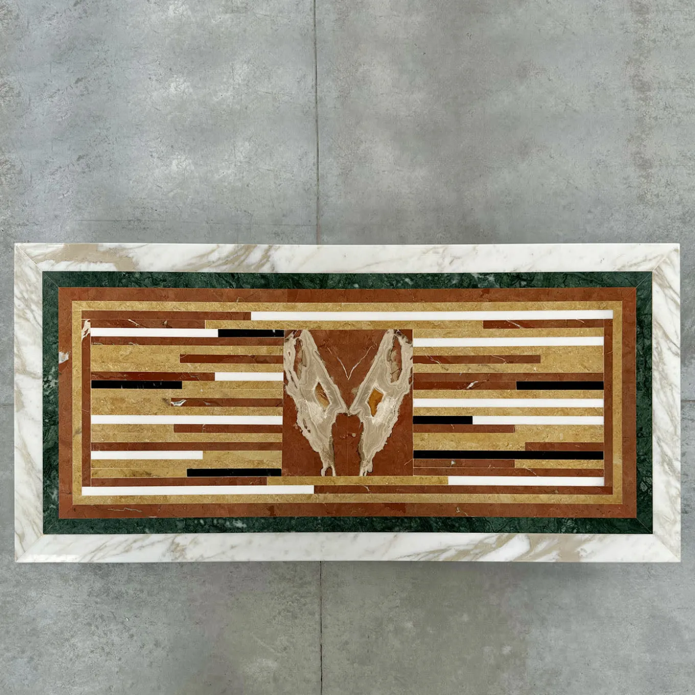 Vis a Vis coffeetable is a remarkable handcrafted piece made entirely from high-quality reclaimed materials. Its surface showcases an exquisite blend of precious marbles, with fine strips of Bianco Carrara, Rosso Alicante, Giallo Reale, and Nero Marquina. The edge is adorned with four marble frames—Calacatta Oro, Verde Guatemala, Rosso Alicante, and Giallo Reale—adding elegance. The base, crafted from solid Bianco Carrara marble, balances stability with modern design. A true work of art.