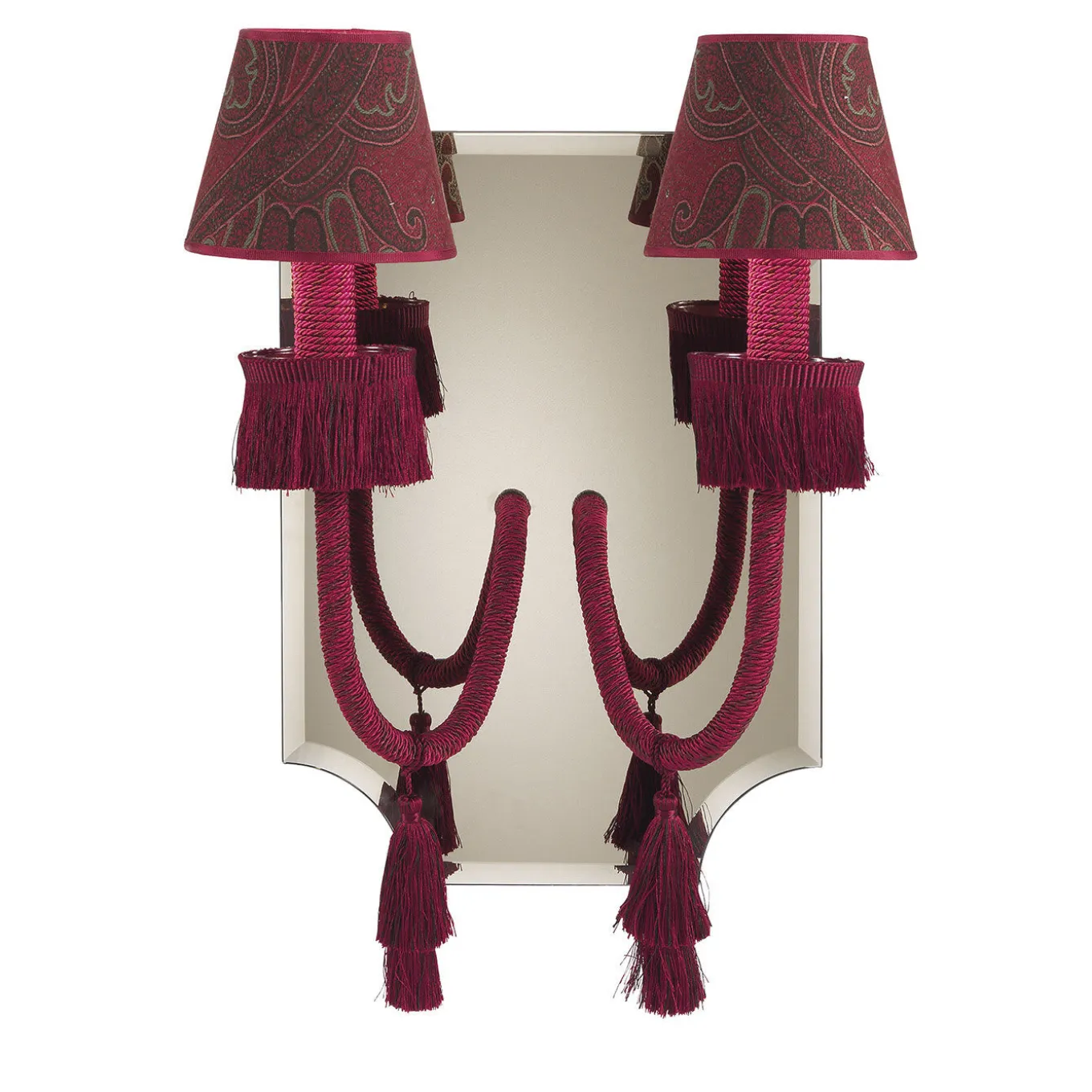 Applique Back panel in patinated bronze wood with front in bevelled bronze mirror. Structure in brass covered with string in silk. Tassels and fringes in silk. Shades upholstered in fabric cat. A Deccan col. 1 Nomad.