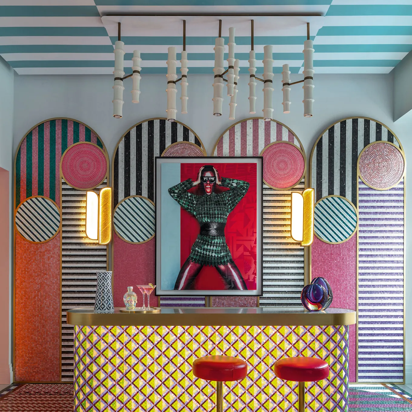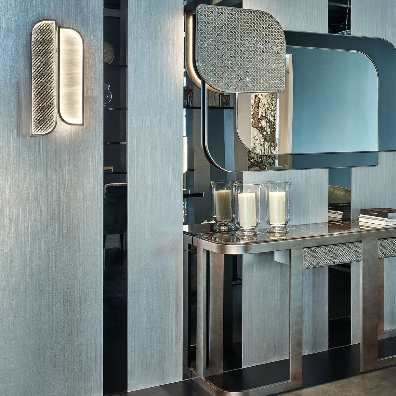 Part of the retro-chic collection, this sconce by Massimiliano Raggi features two mirroring elements of different sizes that celebrate the harmonious coexistence of contrasts. This refined piece is made of metal with the small brass element finished in antique silver, while the other is covered throughout with a mosaic made up of tiny tesserae and inserts in Alicrite. The piece is lit with two LED strips max 22.2 W 3000L color temperature and 2473 lumens. The default voltage is 220V, however other voltages can be requested. This sconce is CE certified.