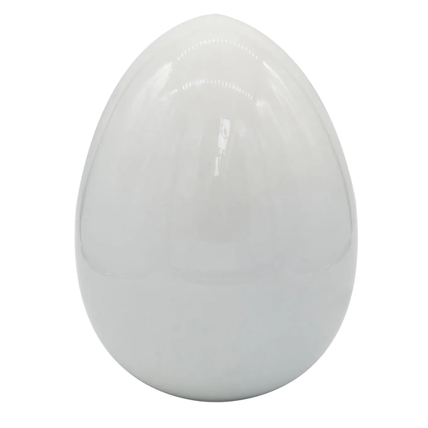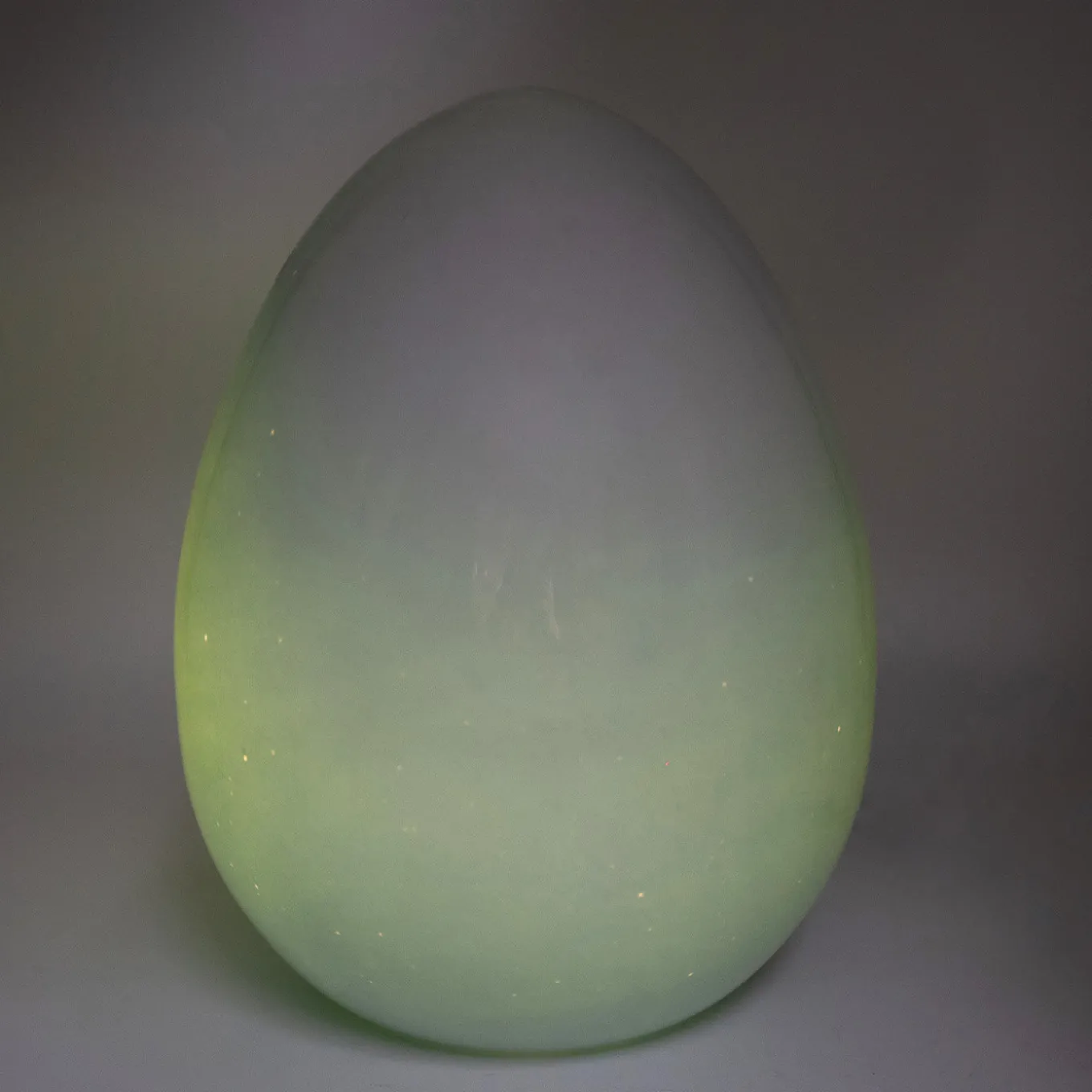 Playful and sculptural, the design characterizing this one-off set of table lamps draws its inspiration from the subtle simplicity of eggs. They are original pieces by Vistosi handcrafted in Murano and stand out for a special green inner sleeve that lends the suffused, output glow a relaxing green shade. When the light supplied by a single E14 bulb is off, the lamps maintain the milky look of eggshells.