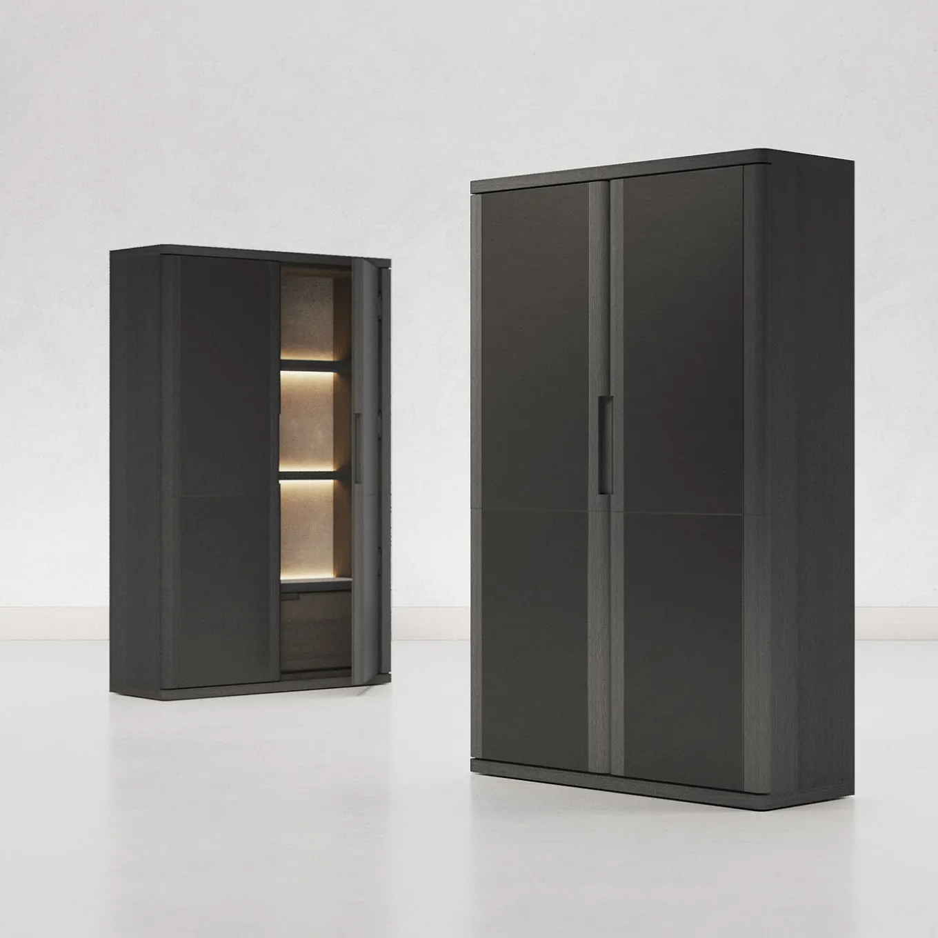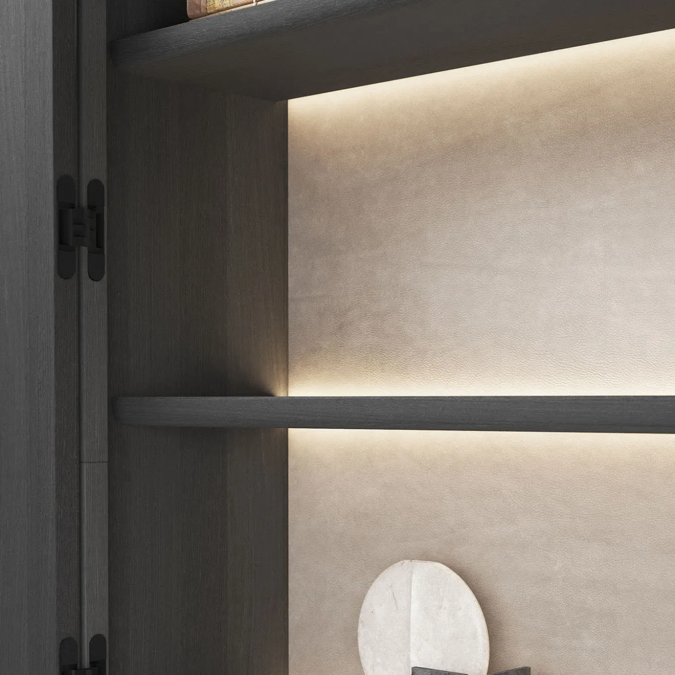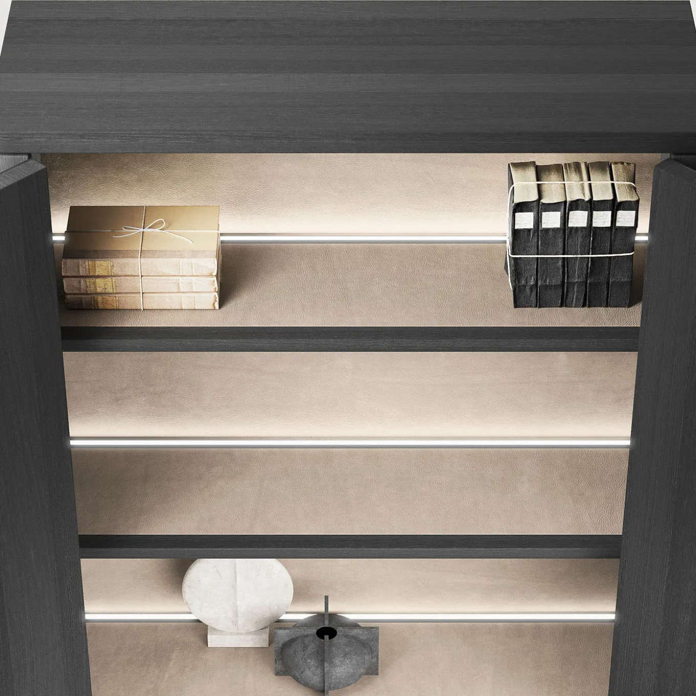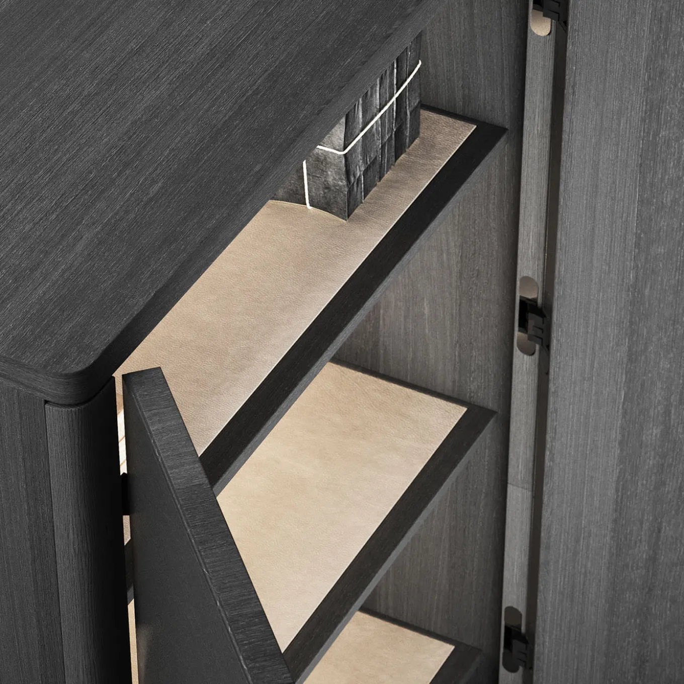The Vittorio high cabinet features a sandblasted black ash wood structure, handcrafted using traditional woodworking techniques. The solid ash blocks are joined with dovetail joints and meticulously milled to enhance the design. Flame-treated to bring out the natural grain, the cabinet combines old-world craftsmanship with modern elegance. The doors are upholstered in black Rough leather, with an optional interior lighting kit for added sophistication. Available with or without doors.