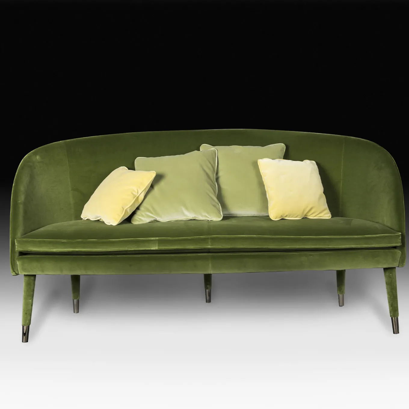 This modern-style sofa seduces with the simple elegance of its harmonious volumes covered in prized green velvet. Richly stuffed with multi-density polyurethane for long-lasting comfort, the entire frame – also comprising the enveloping backrest incorporating the sloped armrests – combines solid spruce and plywood The tapered legs’ metal tips are finished in 24K gold.