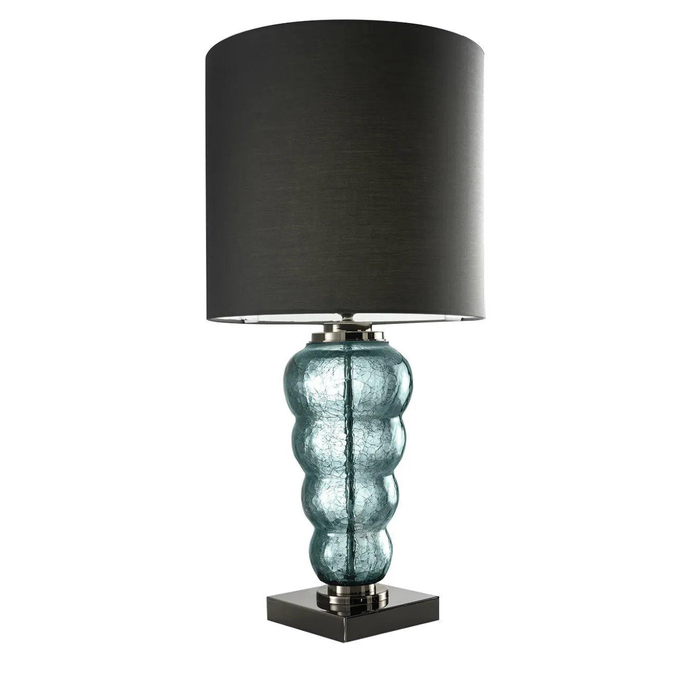 Stacked, hand-blown glass globes create the alluring aesthetic of this elegant table lamp. The square metal base with black finish supports the sinuous body of the mouth-blown viridian Murano glass with a crackle finish, framed at both ends with a concentric, plinth with a polished finish. A tall cylindrical lampshade in gray polycotton fabric and vinyl lining finish the look with sophistication. This table lamp will make an elegant accent for any transitional style interior that blends contemporary and traditional design.