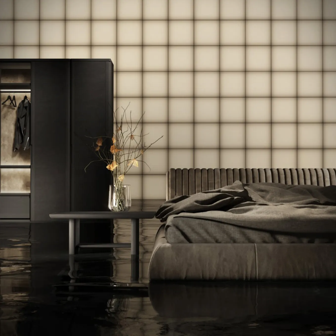 VOYAGE D’UNE NUIT Bed is part of the Sartoria Capsule Collection. The headboard is characterized by a vertical striped padding that runs towards the back, giving the bed an aesthetic connotation of strong impact. The bed frame, characterized by a tapered silhouette, joins the headboard, making the product a single piece. Supplied with a wooden slatted base, this bed is available completely covered in fabric or leather.