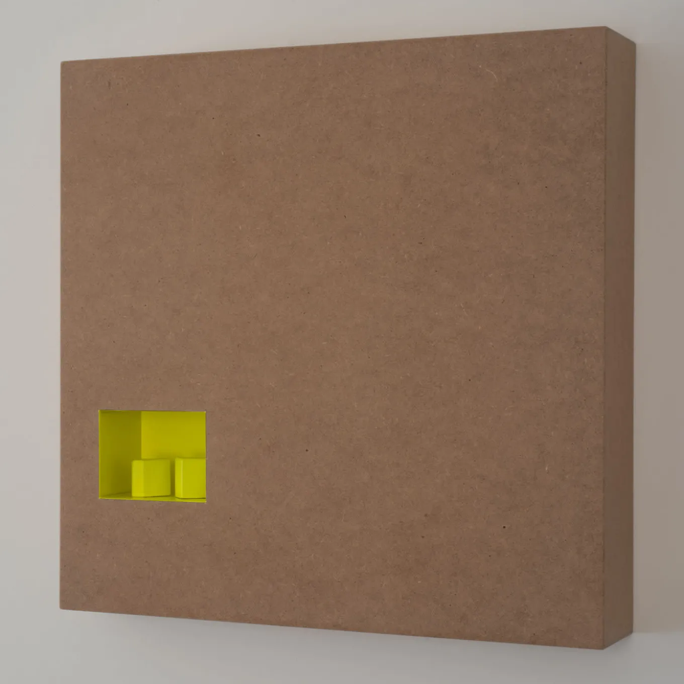 Contemporary artist Marco Grassi’s unique and inventive style is brilliantly embodied in this minimalist oeuvre, encouraging the viewer to follow the interactions between light and shadows, filled and empty spaces enclosed in a rigorous square shape. Handmade of wood in 2017, it features one concave space filled with two volumes, all lacquered in fluorescent yellow. Please consult the Artemest catalog for other available designs from this series.