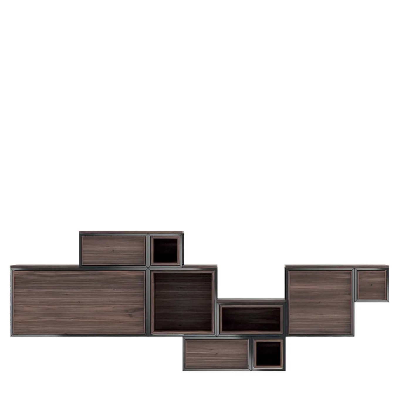 An exquisite piece of functional decor, this series of shelves will be a versatile, practical, and striking addition to any wall. The structure is in metal with a black nickel finish, while the wooden elements are crafted of Canaletto walnut and create a series of rectangular and square volumes, some as open compartments, some as drawers. Either featured in an entryway as console, or part of a living room or a study, these shelves will be a precious furniture piece.