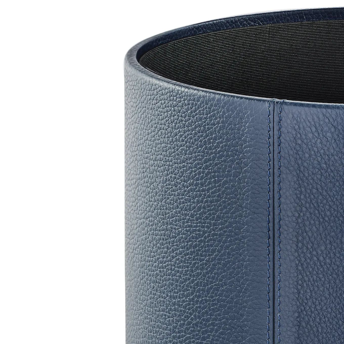 A sophisticated complement to a home study or an office, this waste paper basket will add elegance to a room, thanks to its exquisite craftsmanship. Its cylindrical shape is clad in genuine grain leather, here featured in blue, but available in 13 different colors. The internal rim is equipped with small flaps to hide a bag that can be easily removed to keep the piece clean.