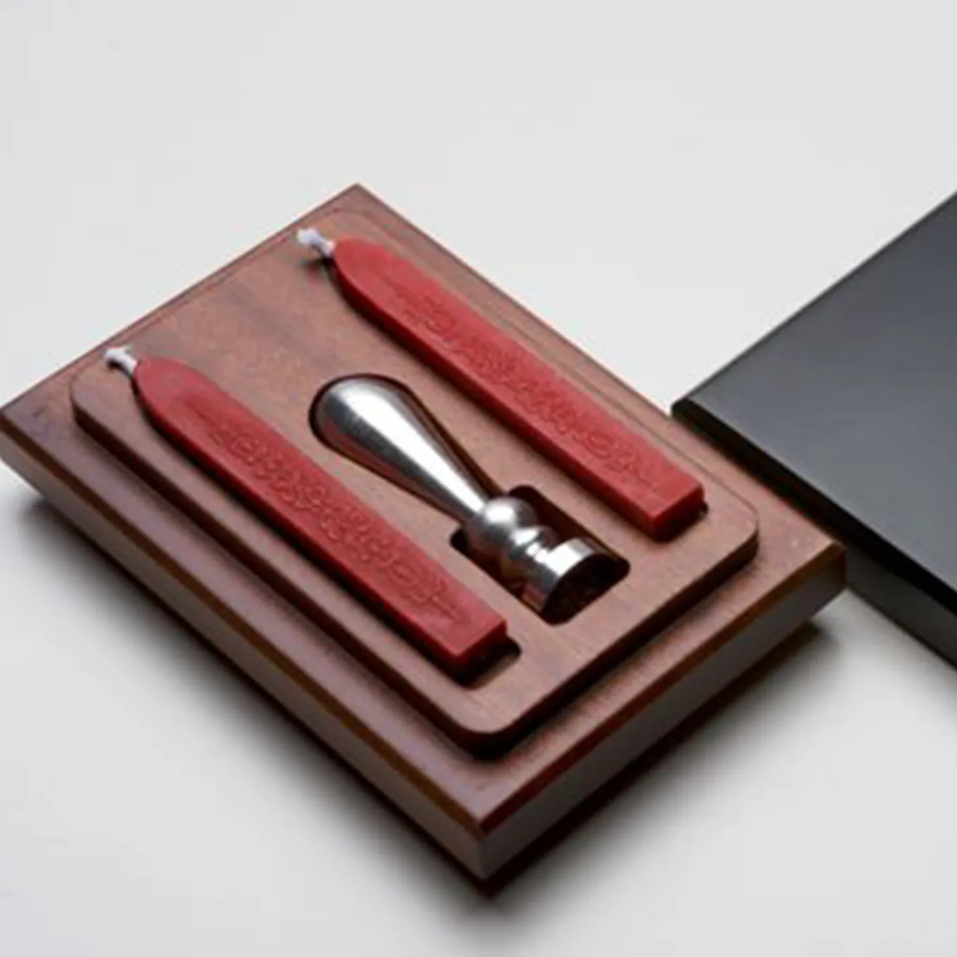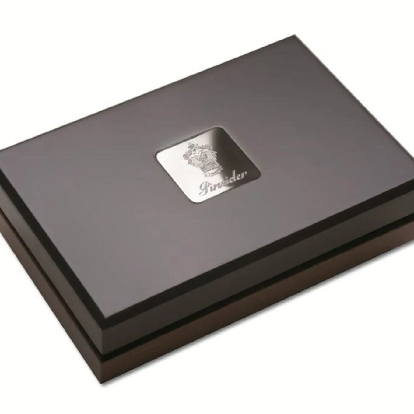 This lavish wax seal stamp kit is contained in a prized mahogany box featuring a black-lacquered cover with the engraved Pineider coat of arms. The kit comprises an aluminum stamp for the two red wax candles and three spare sealing wax sticks (Ø 2 cm) in green, gold, and silver. Special requests of monograms, logos or texts are available upon request, please ask the Concierge for details.