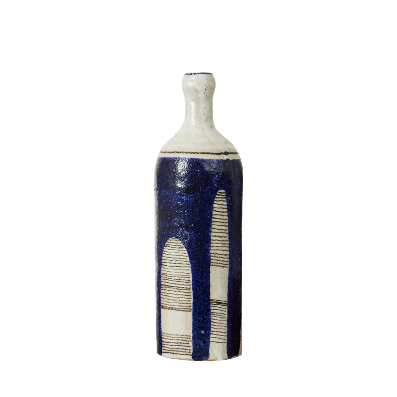 This exquisite bottle was entirely made in ceramic and its enamel glazed using ancient artisanal methods. The white background is highlighted by striking blue patterns, adorned here and there by delicate brown lines that run parallel, creating a dynamic effect on the surface of the piece. Due to its handmade execution, no bottle will be exactly as the other. This one-of-a-kind piece is modernity and tradition at the same time.