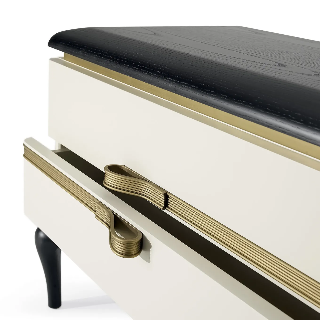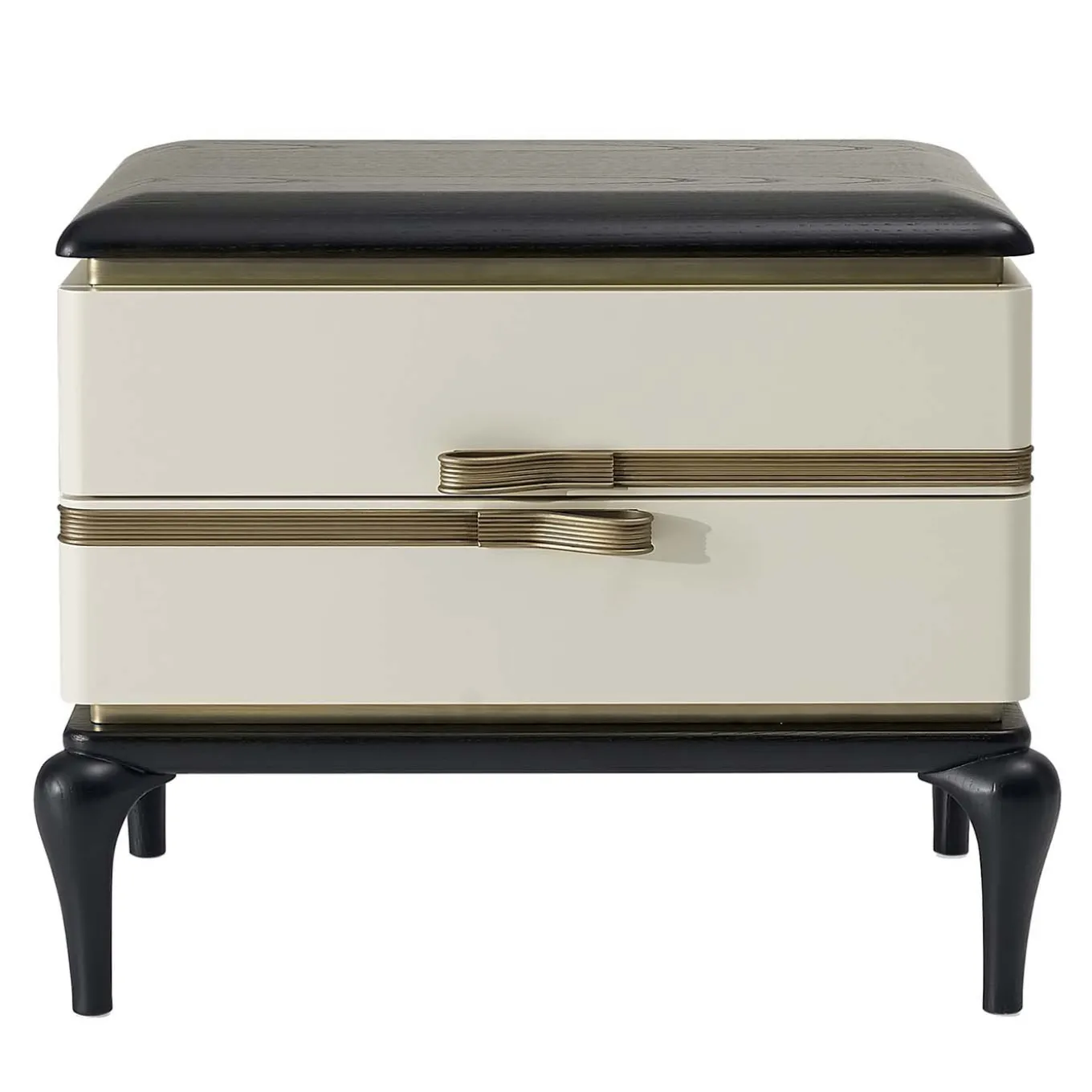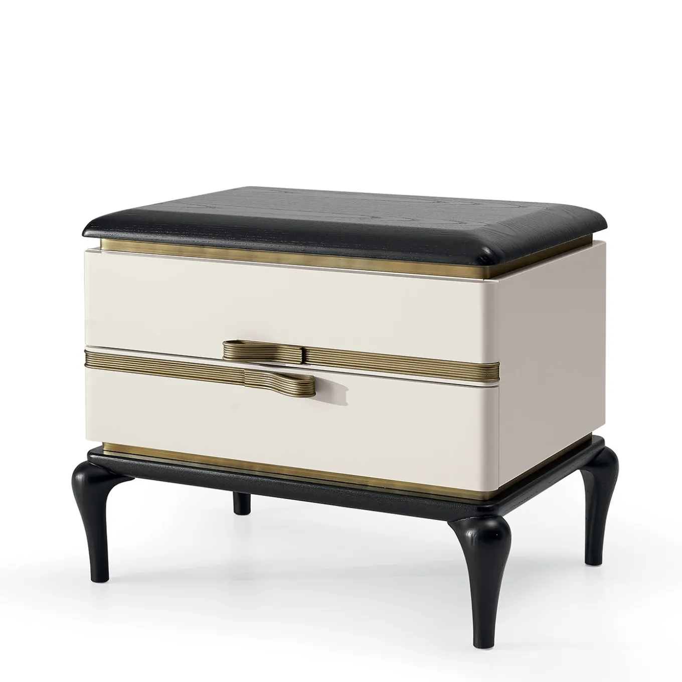 An elegant and sturdy piece of functional decor, this bedside table exudes a modern allure in its combination of black and white and burnished brass. A small piece with two drawers, it is composed of white-lacquered plywood and ash-veneered MDF structure, enclosed between a black-lacquered solid ash top and sinuous cabriole-style legs.