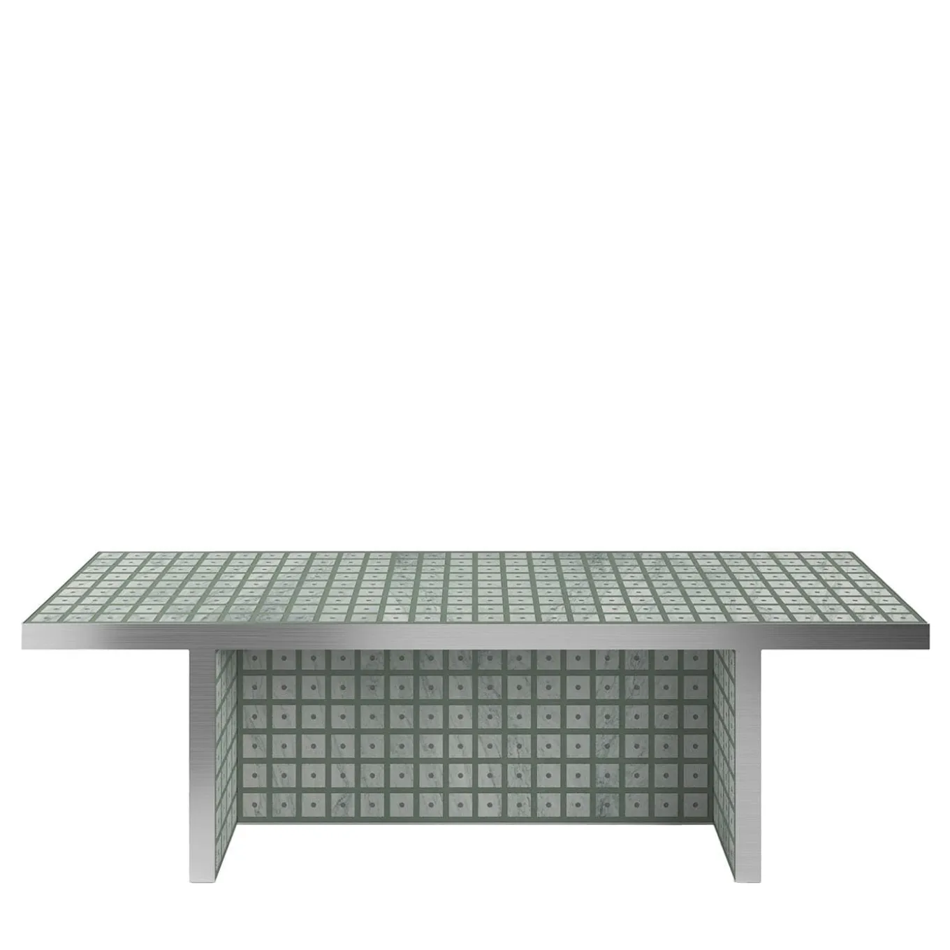 A stately silhouette consisting of orthogonally intersecting volumes marks this bench, piece simply demanding attention with its extensive and repetitive geometric pattern. Squares of prized white Carrara marble emerge from green-toned concrete, a motif sure to hypnotize while stating its opulence. Brushed steel profiles stress the structure’s general rigor and stability. Please consult the Concierge for variants.