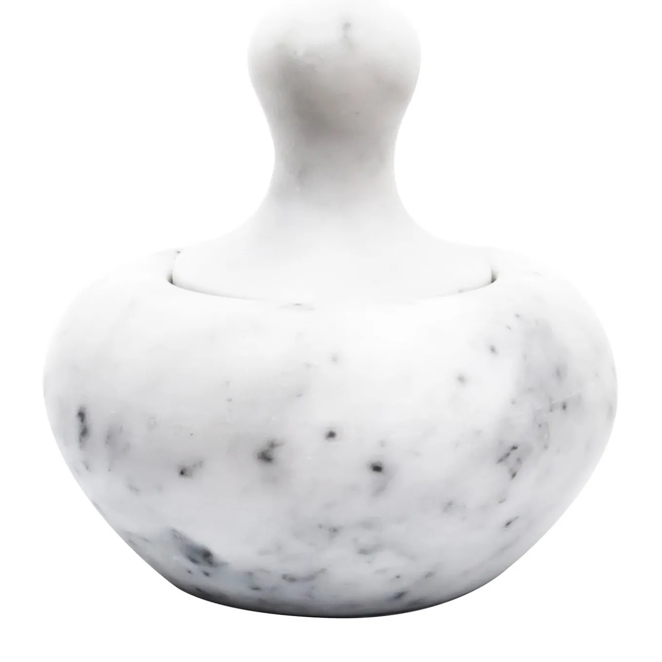 This precious set in white Carrara marble, counting a compact mortar with a complementary pestle designed to crack nutshells, will be an exclusive addition to any kitchenware collection. Each piece is entirely unique thanks to its artisan manufacturing process carried out by expert artisans and showcases peculiar veining and shades of great refinement enhancing the spontaneous beauty of the precious stone.