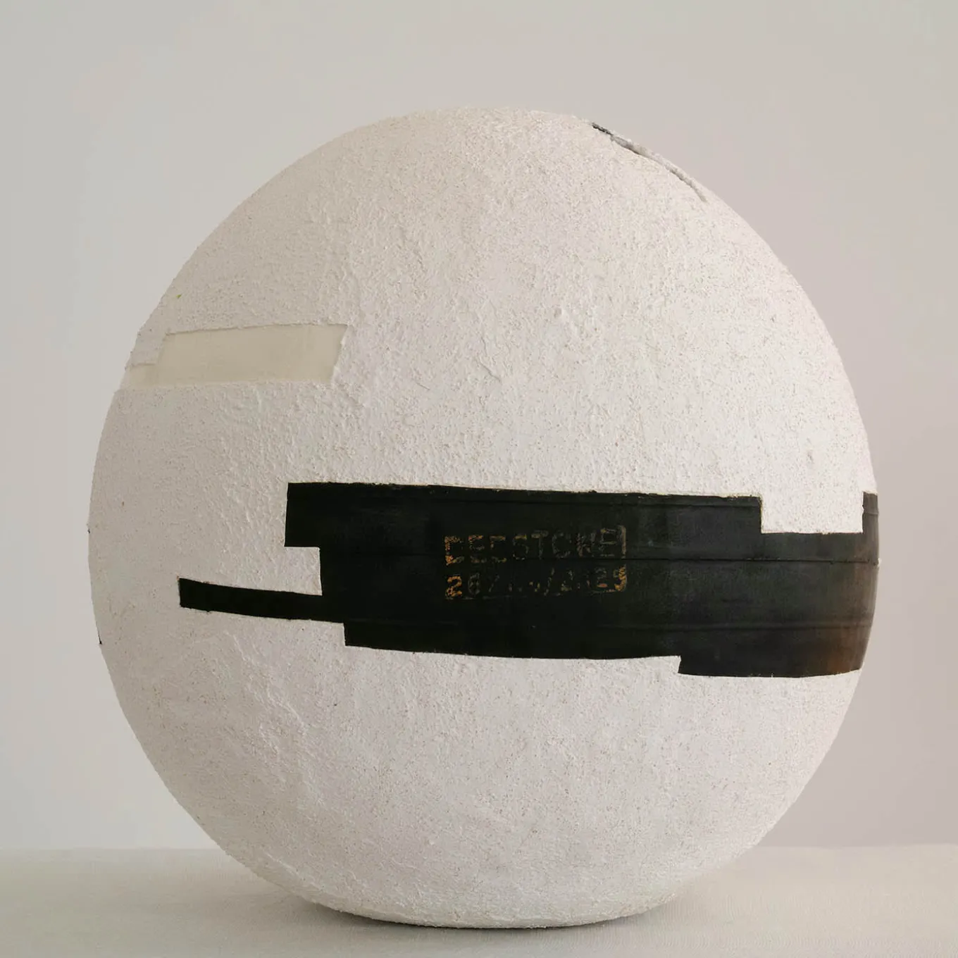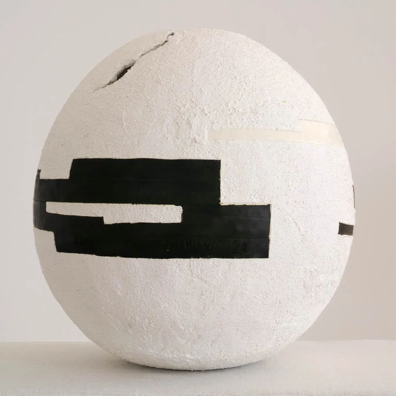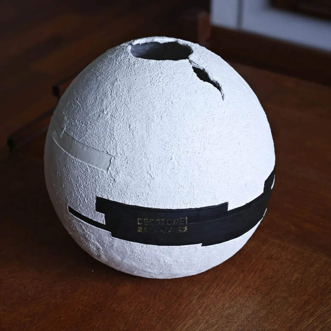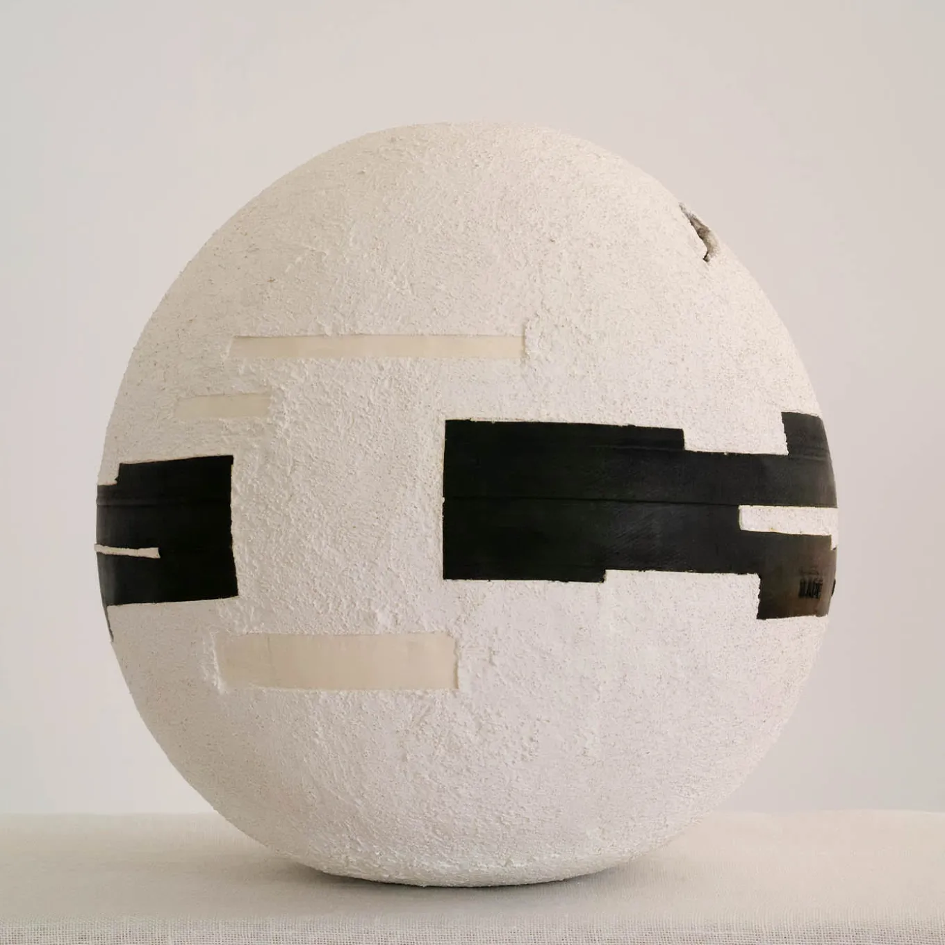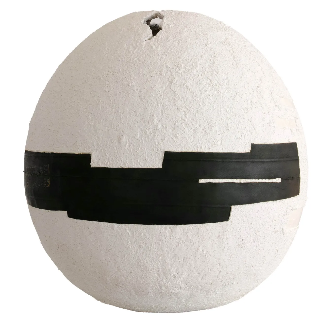 This distinctive sphere, entirely handcrafted from cement, Carrara white marble powder, and ceramic powder, is a masterpiece of texture and geometry. A vertical crack divides the upper surface, while the exterior is coated with a granular white cement layer. Embedded in the design are black geometric inserts sourced from tire inner tubes, paired with four glossy white enamel stripes. Despite its raw material construction, this sphere is lightweight yet delicate, requiring careful handling.
