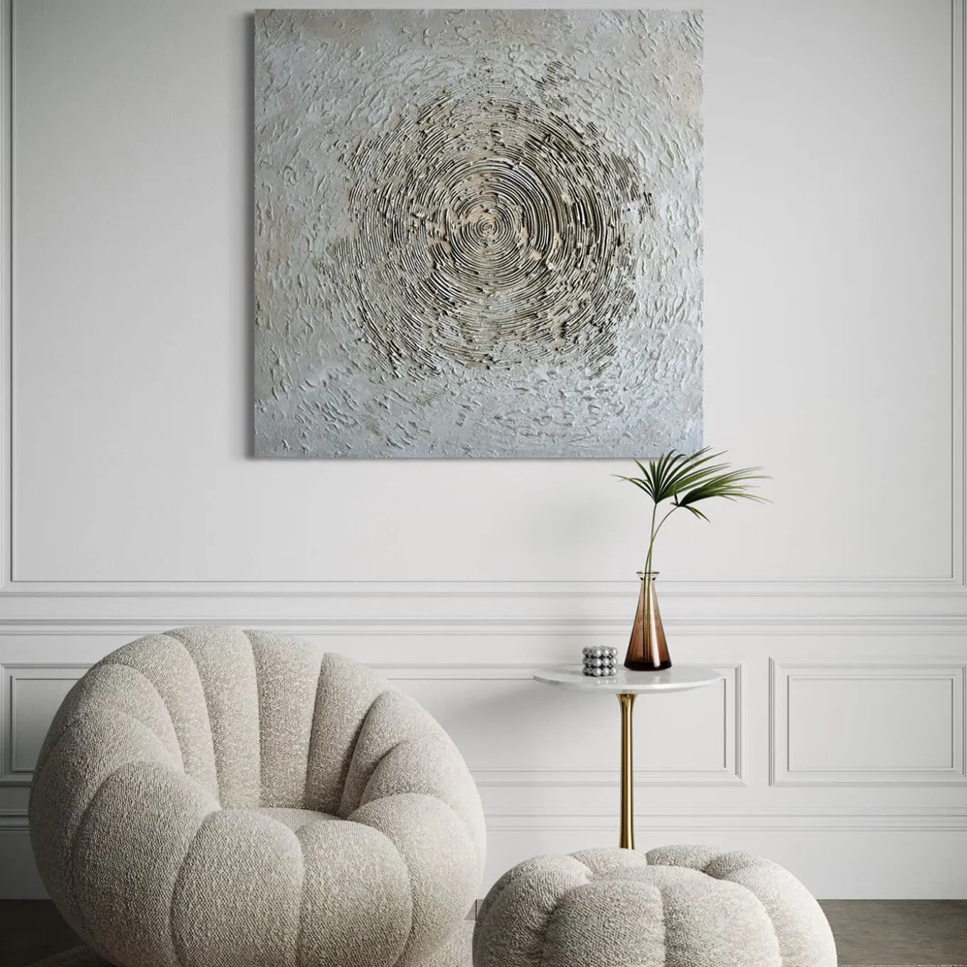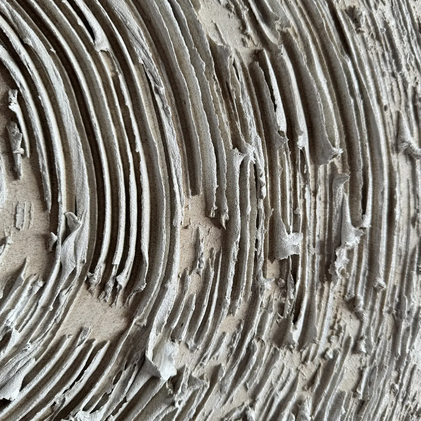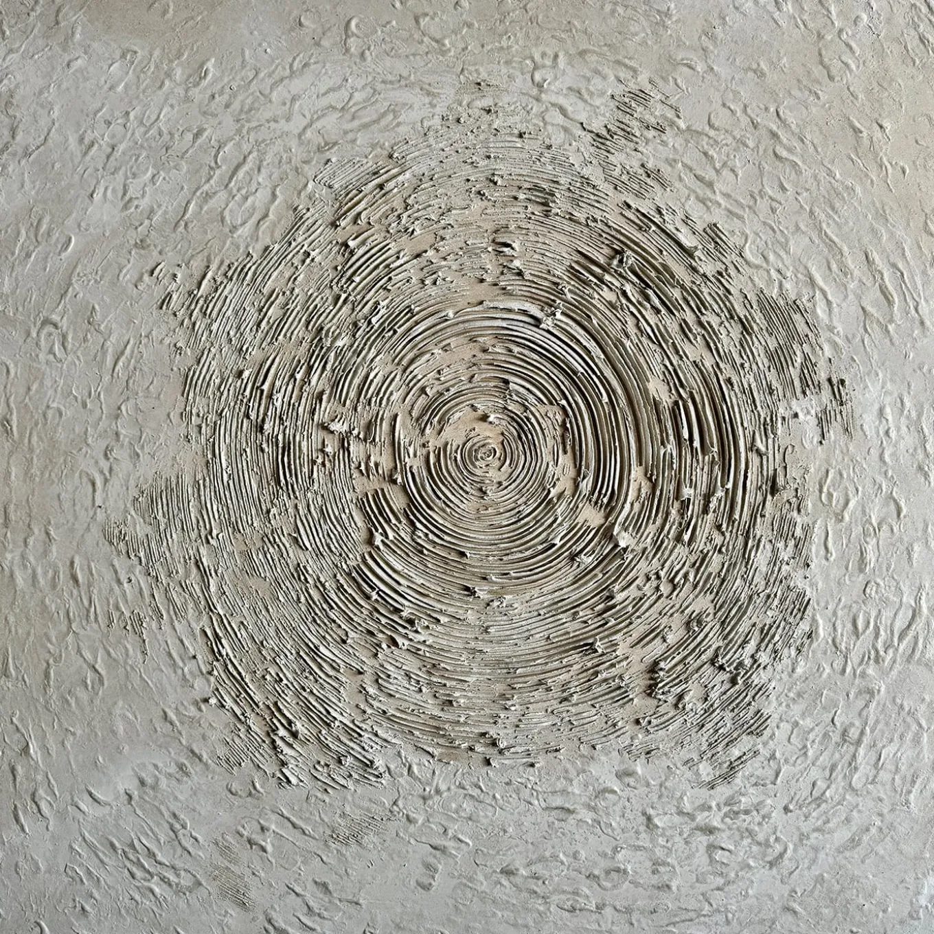 Defined by a striking interplay of textures, this artwork evokes the mesmerizing effect of a circle fracturing outward into an infinite wave. Its white and sandy tones blend seamlessly, capturing the essence of expansive motion. Despite its static nature, the piece creates a compelling illusion of dynamic movement, engaging the viewer with its elegant and evolving visual rhythm. Crafted using a meticulous technique that accentuates the interplay of different textures. Each painting is unique.