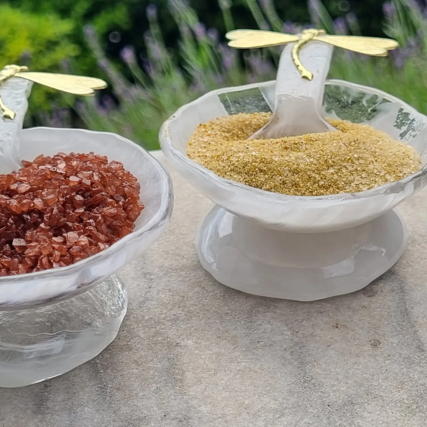 Flawlessly hand-sculpted in crystalline white Murano glass, this sophisticated set of two salt cellars will give an elegant touch to a modern or traditional dining table. Whether to present sauces, dips, condiments, or any dish enhancer, these two versatile pieces feature a rounded silhouette on a refined pedestal base, along with a matching spoon embellished by a captivating brass dragonfly. Measure 9cm in diameter.