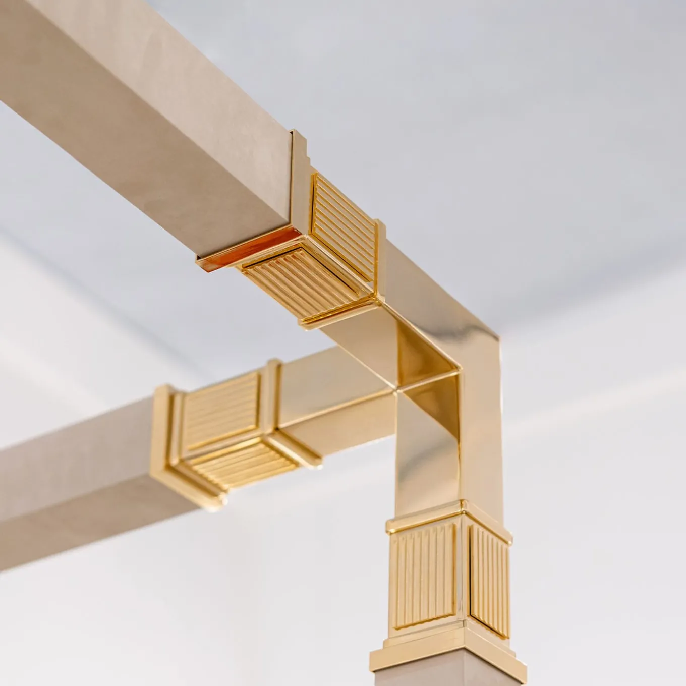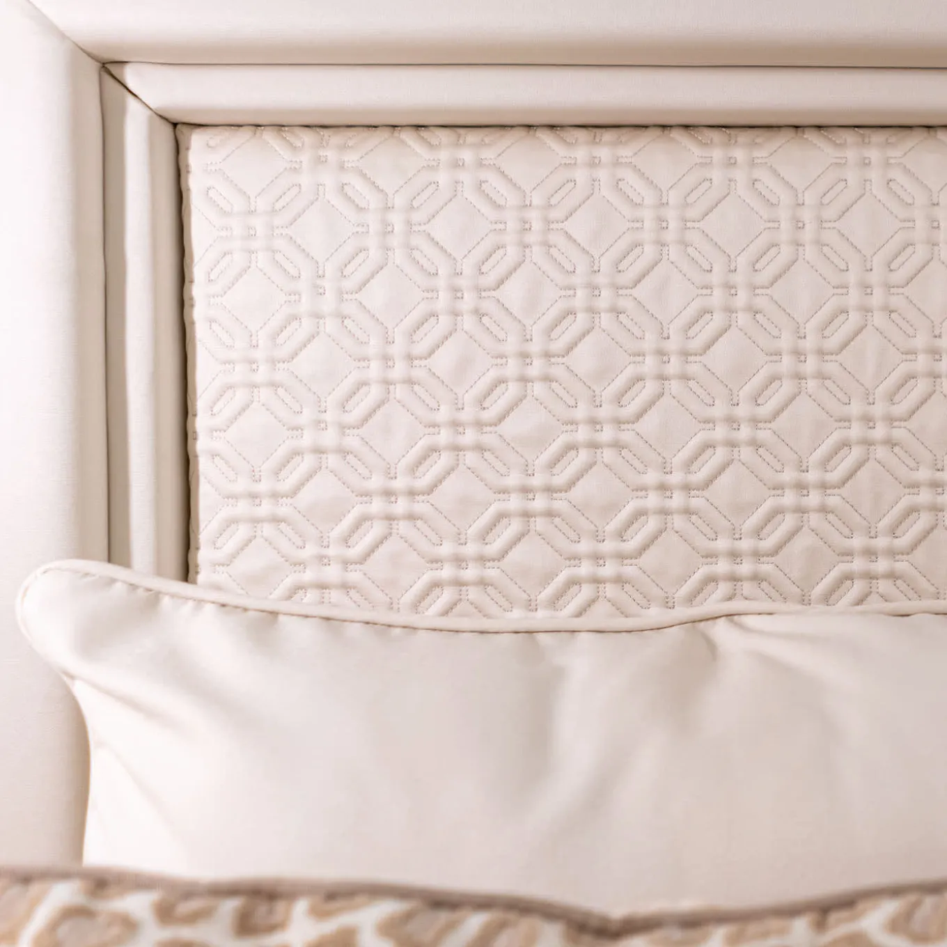 Opulence and refinement splendidly merge in this double bed, made strikingly romantic by its canopy design. Combining glistening 24K gold-plated bronze details with genuine white Nubuckcleather, it reveals an unmistakable sartorial charm further emphasized by the pattern of octagons minutely embroidered on the headboard’s fabric cover. A luxurious addition to classic-style bedrooms.