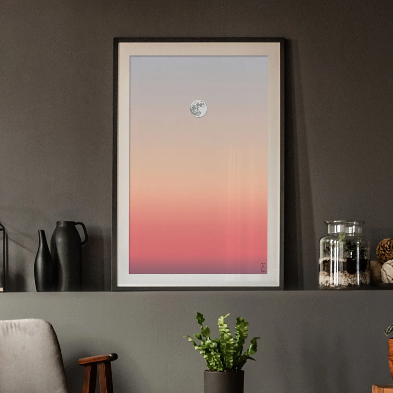 This evocative print depicts a full moon – fashioned of a silver plate – standing lonely against a backdrop where warm gray progressively fades to apricot orange and mauve. Inspired by a romantic line Italian poet Giacomo Leopardi dedicated to the moon, this dreamlike image is glycée printed on a 100% cotton canvas. Please refer to the Concierge for the 50x70cm variant and the optional frame’s price.