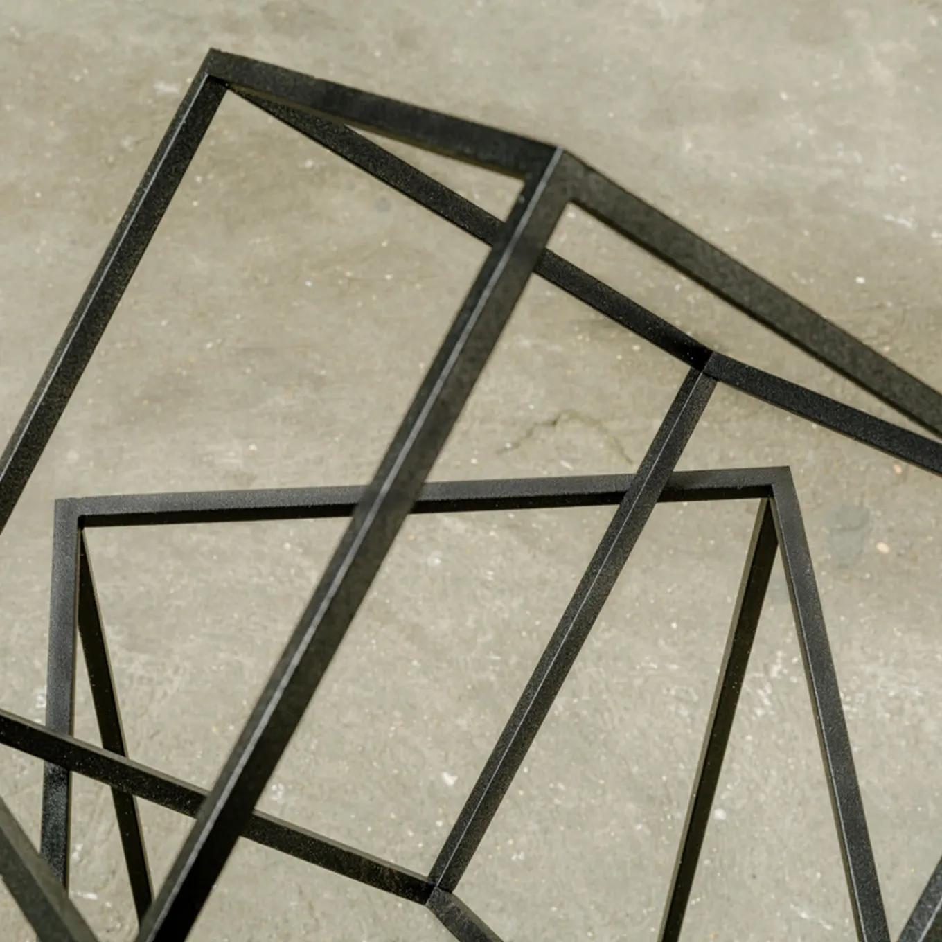 A minimalistic design with a modern edge, this umbrella stand boasts an intriguing, sculptural design that is best displayed along the Who’s Next Magazine Rack, both paying tribute to the legendary British rock group The Who. Crafted of black powder-coated metal, the slim tubular structure is defined by the positive and negative spaces arising from the interplay of the two geometric shapes that compose it. A cube is – seemingly, precariously – balanced on a parallelepiped, creating intersecting lines where the umbrellas rest.