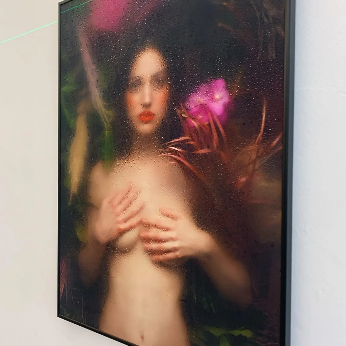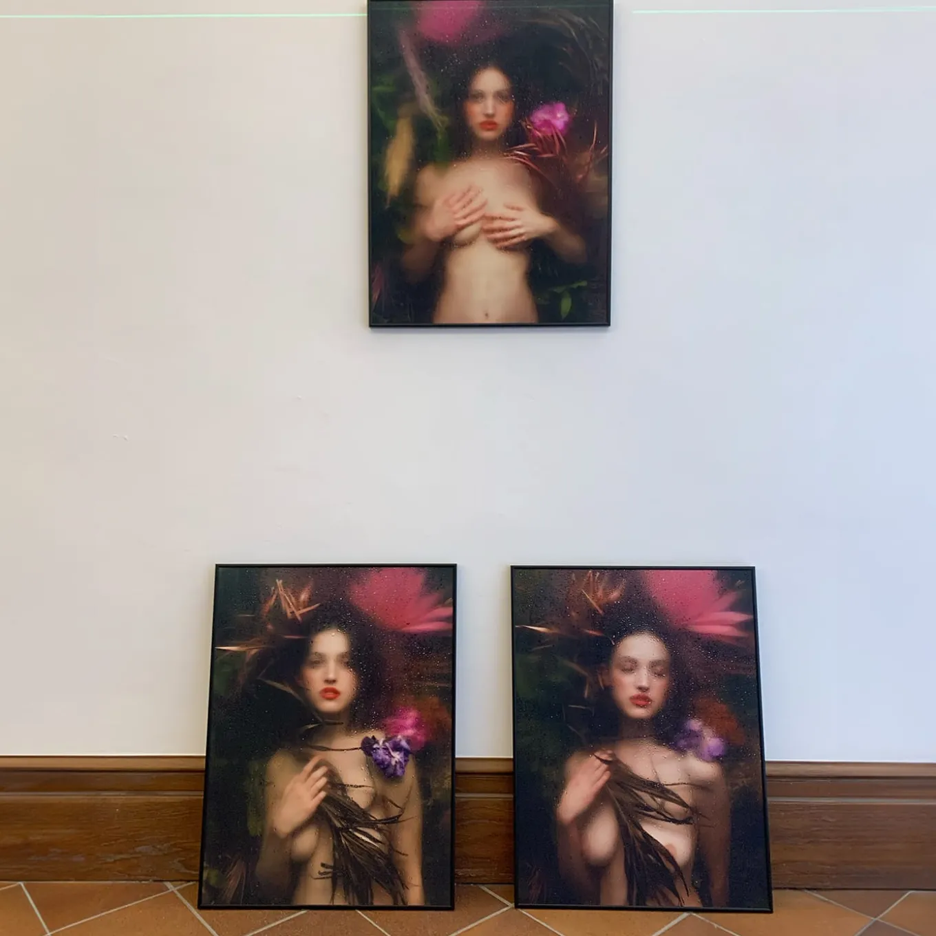 A nude model surrounded by colorful floral compositions is the romantic subject Gradella captured through a translucent panel for this refined photographic portrait. Impressed on 100% vegetal paper, its retouch-free quality allows for a faithful rendering of the surface effect, making this fine-art print an authentic work of art. Please contact the Concierge for available variants and customizations.