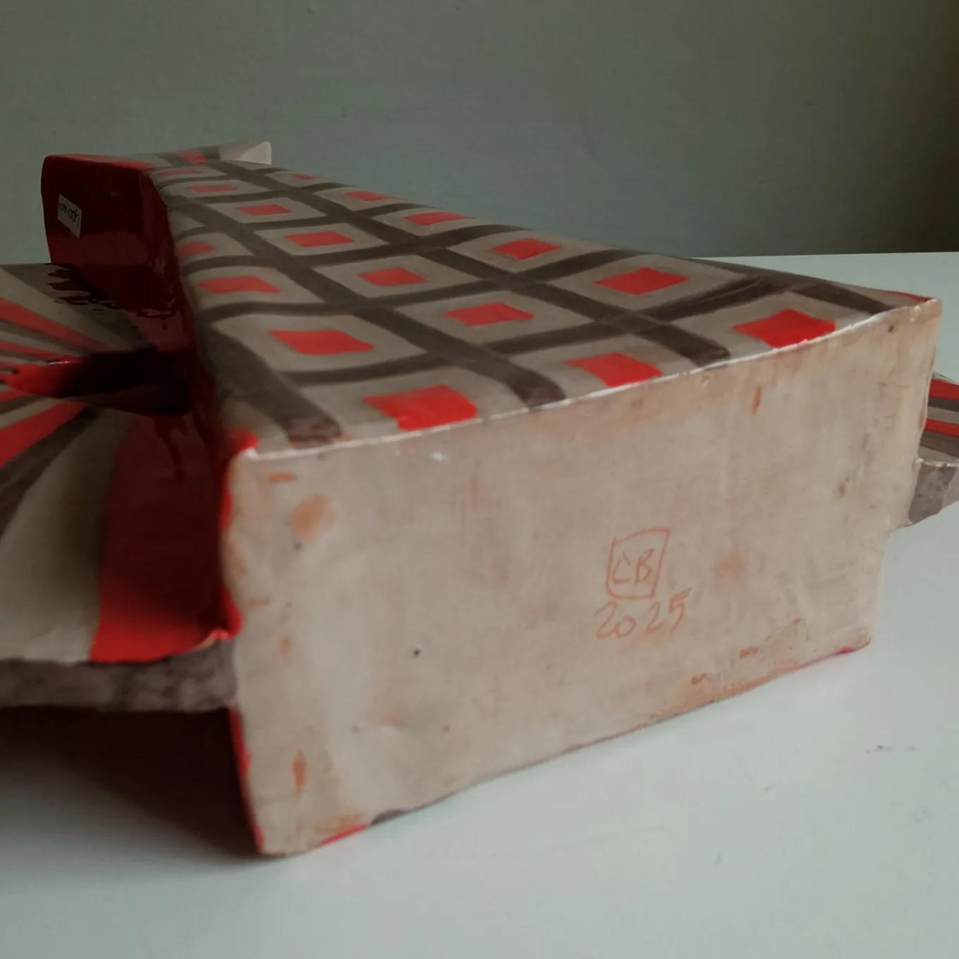 This striking decorative vase features a bold, geometric design with a combination of circular and trapezoidal forms. The piece is accented by alternating red and muted brown stripes and squares that create dynamic visual interest. This mid-sized vase offers a contemporary statement, ideal for adding artistic flair to modern interior spaces. Its unique silhouette and vivid pattern make it a standout accessory for display on shelves, consoles, or tabletops.