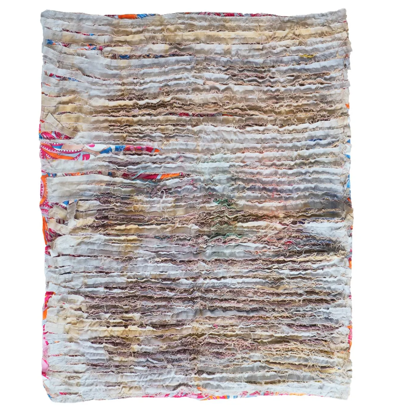 Abstract paintings in textile. In a long and meditative process, layer upon layer of fabrics -some precious, some salvage- are placed on top of one another to create fields of colour; they are then sewn into rows, or other geometric forms and subsequently cut and subjected to a special washing process which draws out the colours and textures from underneath. The result is a painting in textile which is ancient yet contemporary, precious yet punk. Designed and made by Nuala Goodman.