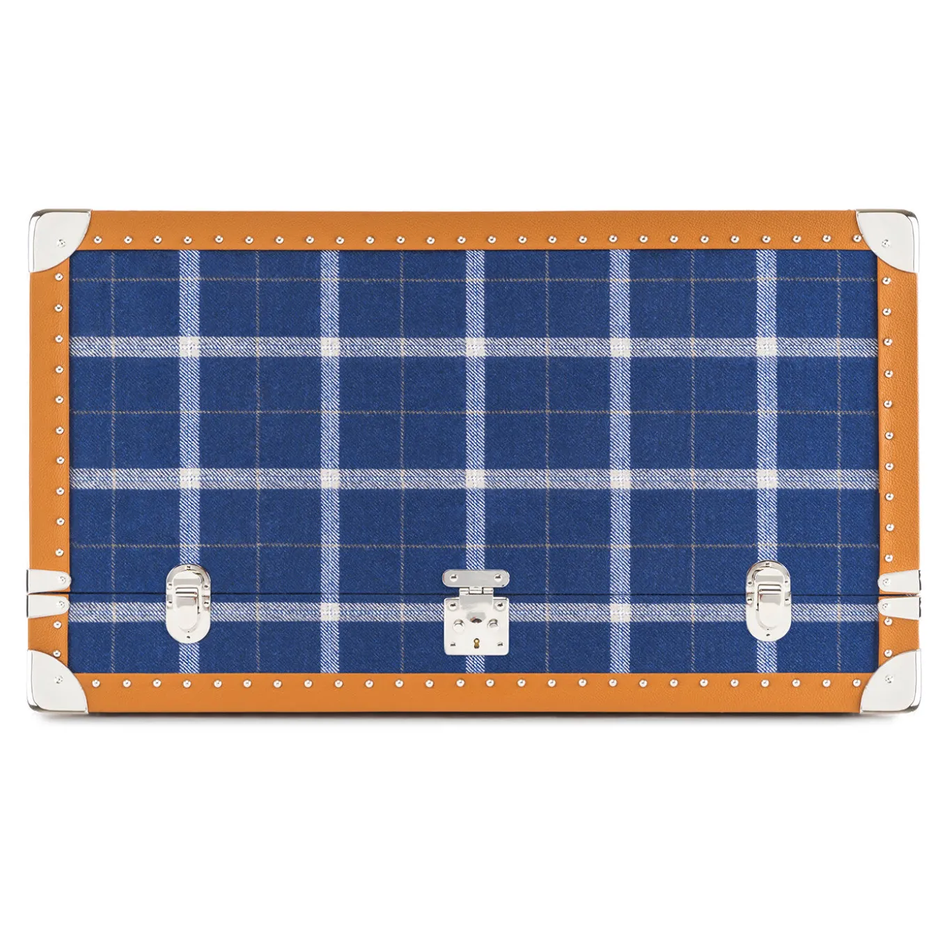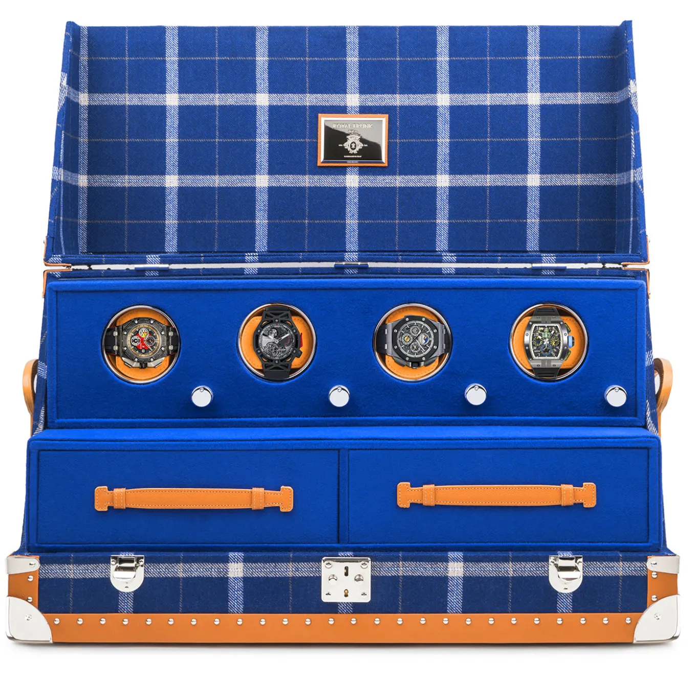 This limited edition trunk is the perfect object for watch lovers. An outstanding piece that exudes luxurious glamour, it is composed of a rectangular structure with a flip cigarette top that opens to reveal a rectangular element with four Swiss watch winders and two drawers to contain up to ten watches. Entirely covered in elegant Loro Piana fabric, the exterior has a blue tartan pattern and calf leather details and the interior is entirely lined in royal blue. This trunk will be a unique gift that will be well appreciated.