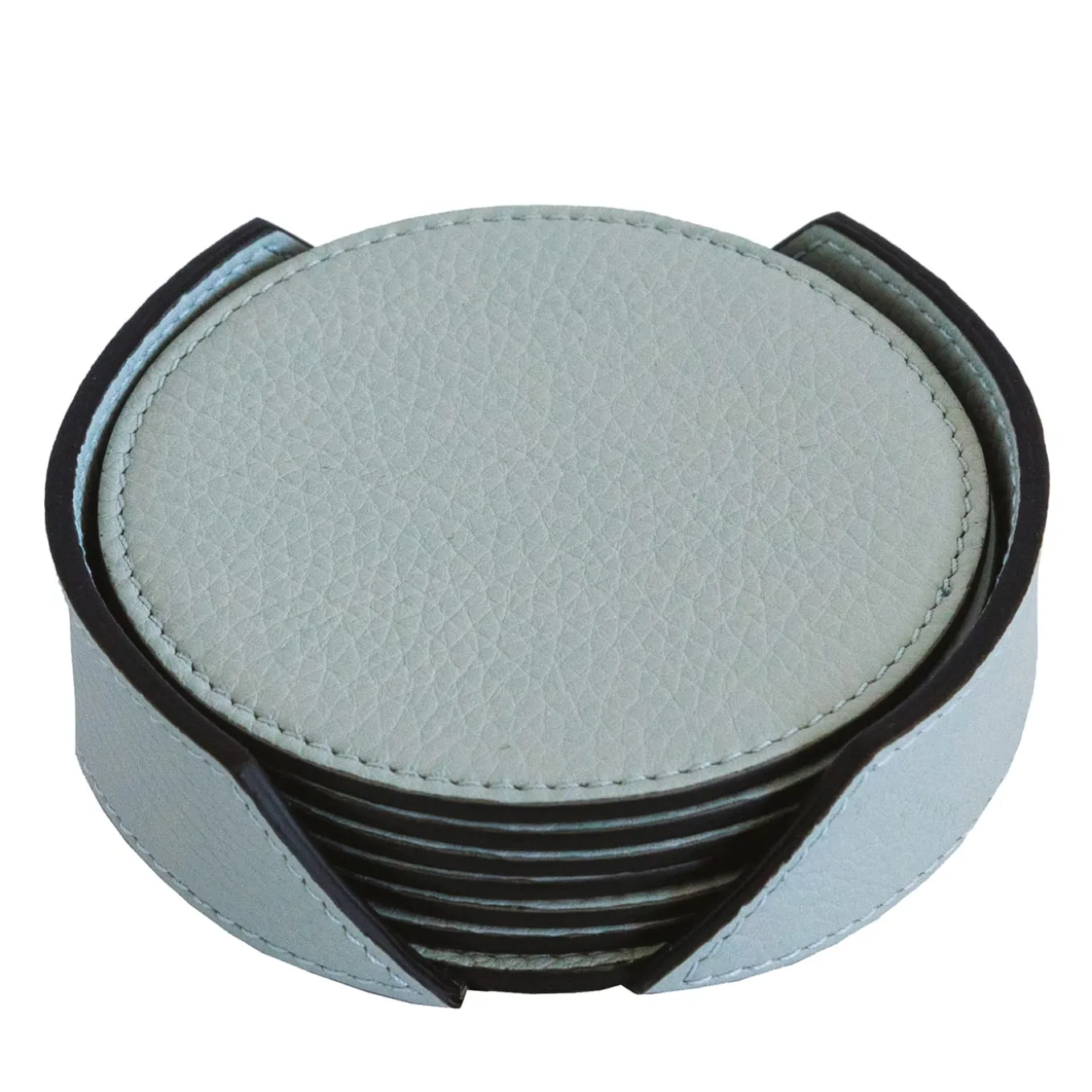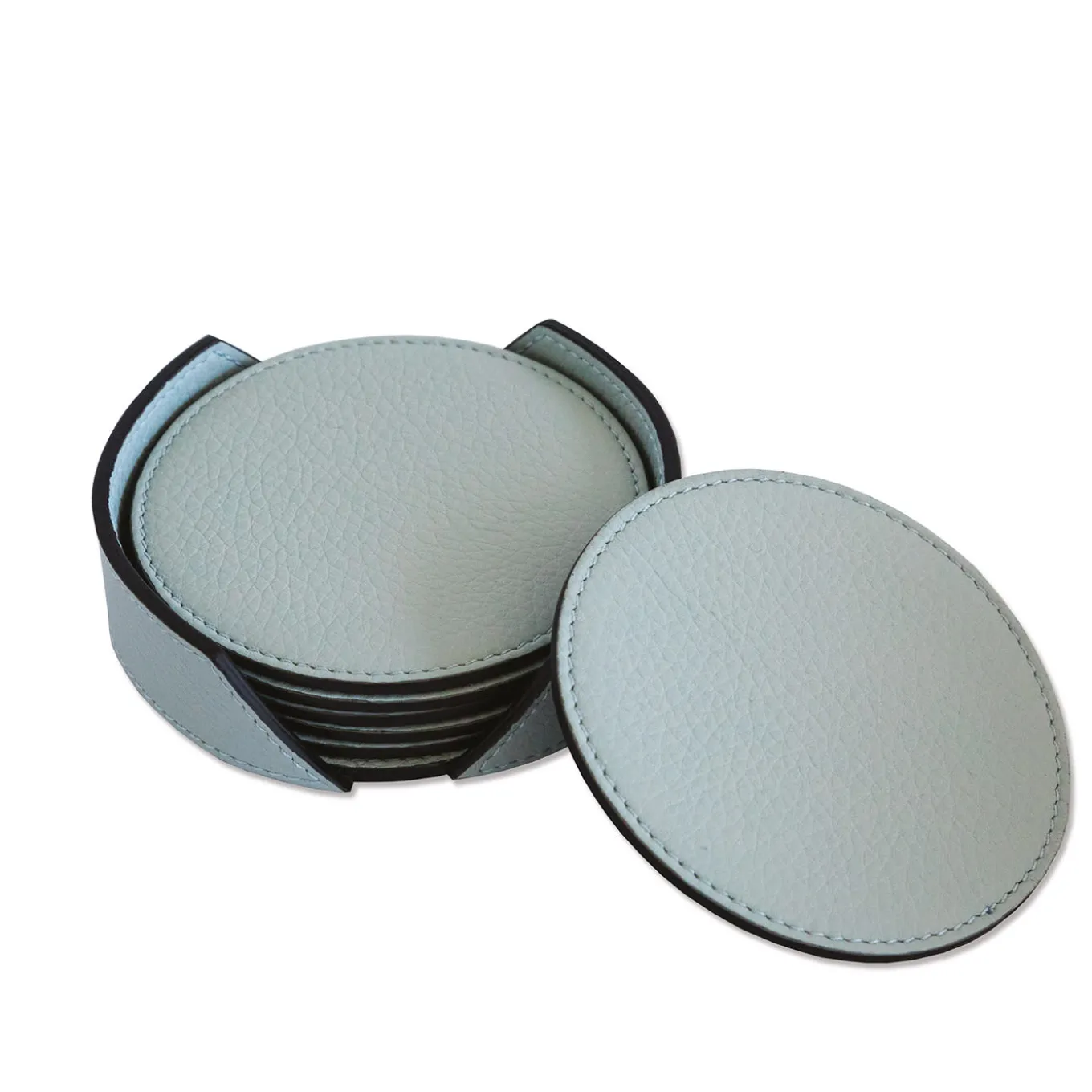 This stunning set of six coasters with a box is characterized by a mesmerizing and utterly stylish light blue shade, which will effortlessly decorate modern and contemporary decors. Handcrafted of fine and soft genuine full-grain leather enhanced with tone-on-tone stitching. Available in 14 colors, please check the Artemest catalog for details.
