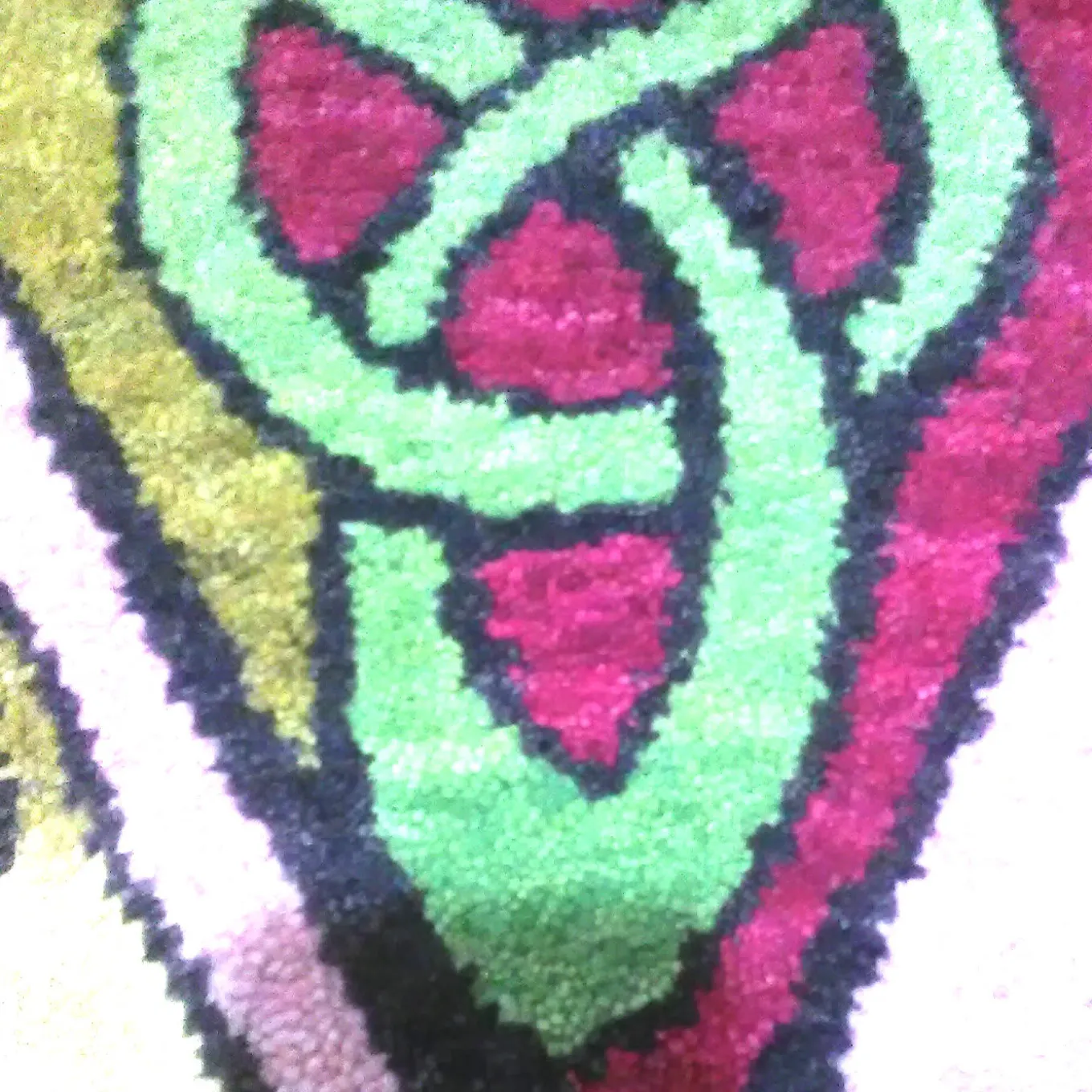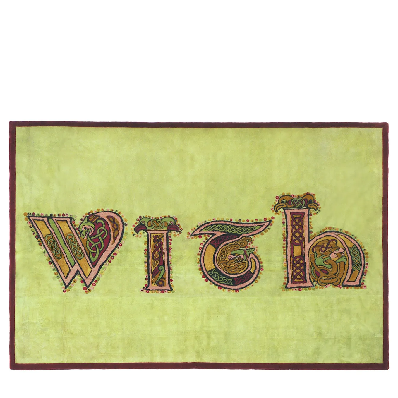 Part of the Book of Kells rug series, this piece takes inspiration from the illustrations found in a Celtic manuscript from the 6th century, and it reinterprets these designs in a modern way using texts relevant to the world we live in today. On this rug, the word “with” is written using the twisting and animated Celtic lettering. This piece was entirely hand knotted in India by expert rug makers using a 90% wool and 10% silk blend and it is customizable in its size. This is a timeless piece which can suit any decor.